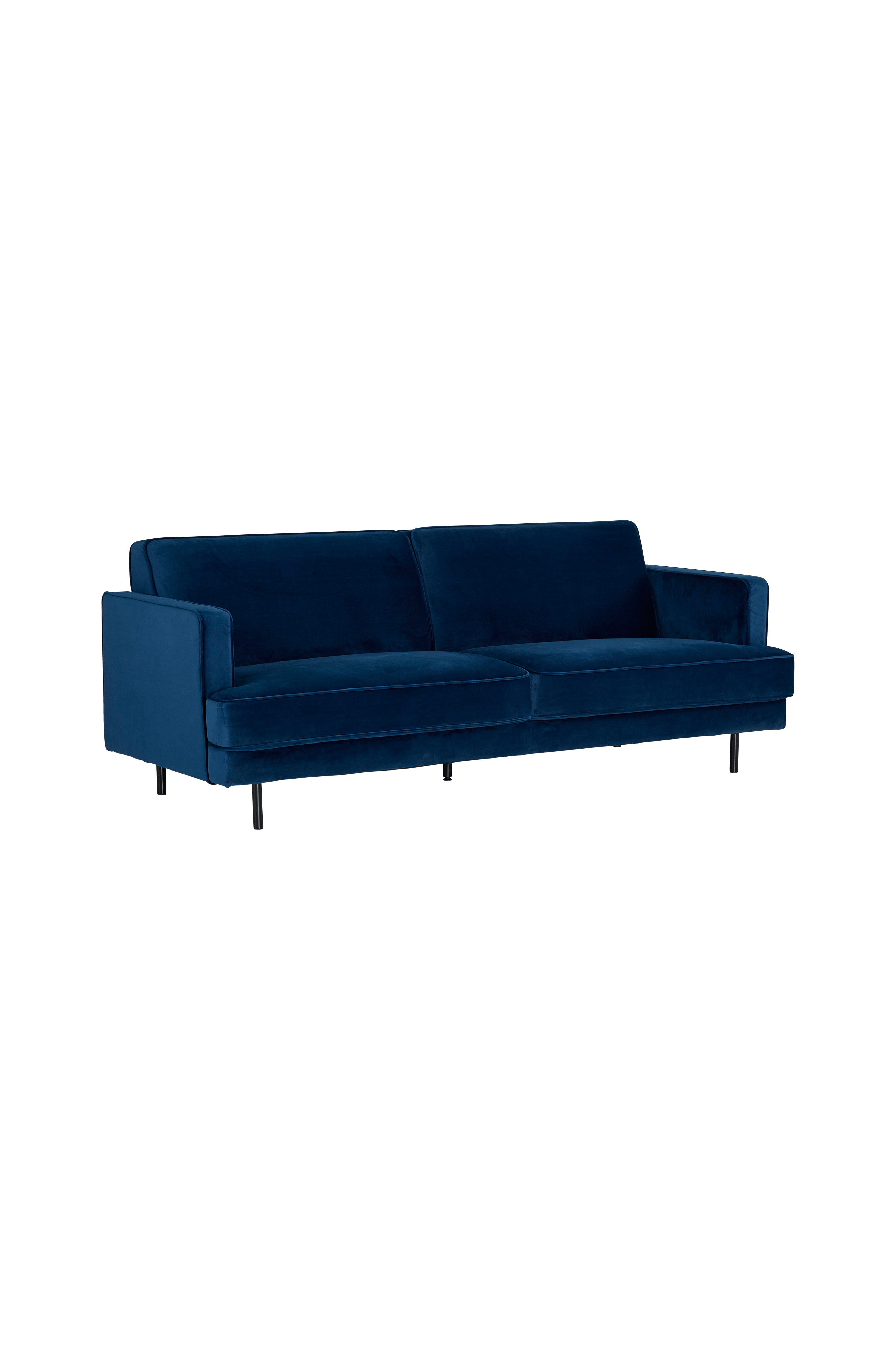 3-sits soffa i klassisk modell med klädsel i sammet av polyester, martindale >25.000. Ej avtagbar klädsel. Ramen är tillverkad av massivt trä och plywood. Fyllning av polyeterskum. Ben av svartmålad metall. Totala mått: Höjd 80 cm, bredd 206 cm, djup 90 cm. Sitthöjd 42,5 cm, sittdjup 56 cm, sittbredd 184 cm. Armstödsbredd 10 cm, armstödshöjd 63 cm. Levereras monterad, endast benen skruvas på vid leverans.