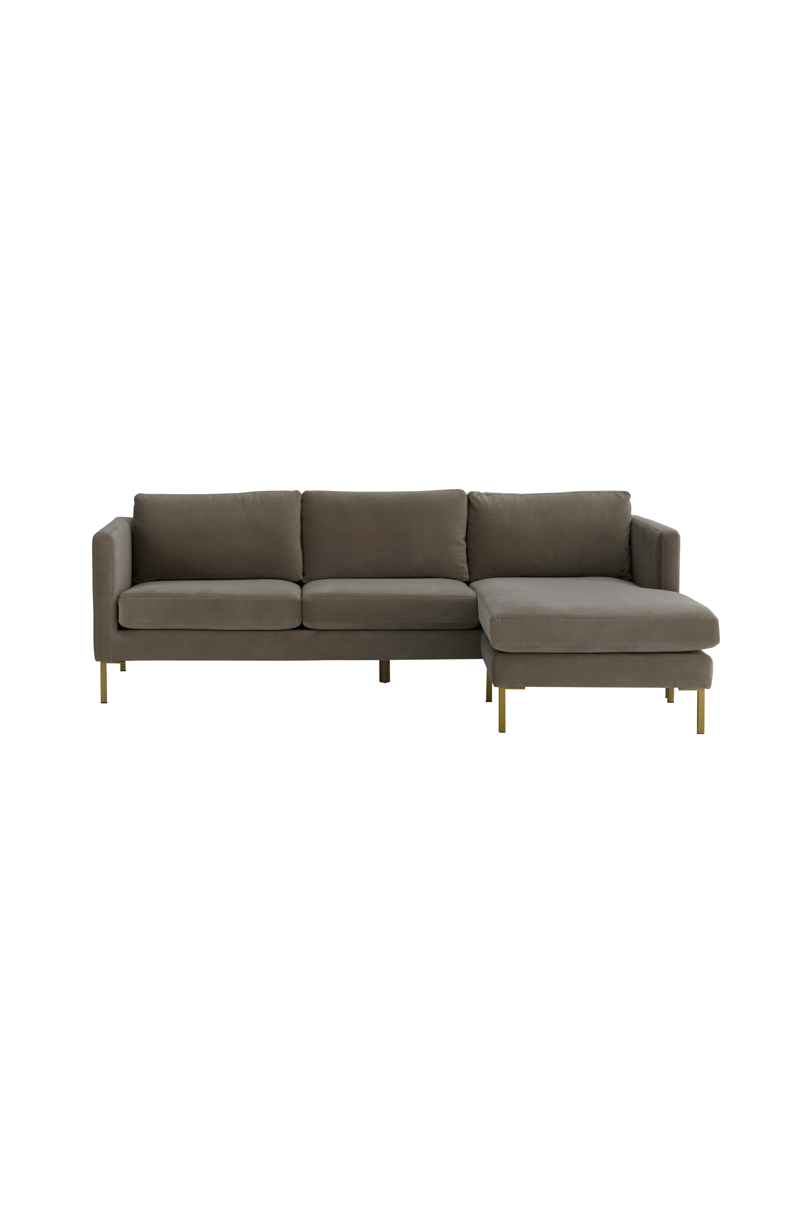 3-sits soffa i sammet. Modell med ett modernt uttryck och en schäslong som kan både vänster- eller högermonteras. Kuddar och dynor är löstagbara. Klädseln är avtagbar på ryggkuddarna, sittdynorna och schäslongsdynan. Fast klädsel i övrigt. Ben av metall. Totala mått: Höjd 83 cm, bredd 243 cm, djup inkl. schäslong 154 cm, utan schäslong 86 cm. Sitthöjd 44,5 cm, sittdjup 56 cm, sittbredd 223 cm. Höjd från golv till armstöd 72 cm. Frihöjd under möbel (benhöjd) 16 cm. Schäslongen och benen levereras omonterade. Martindale >40000.