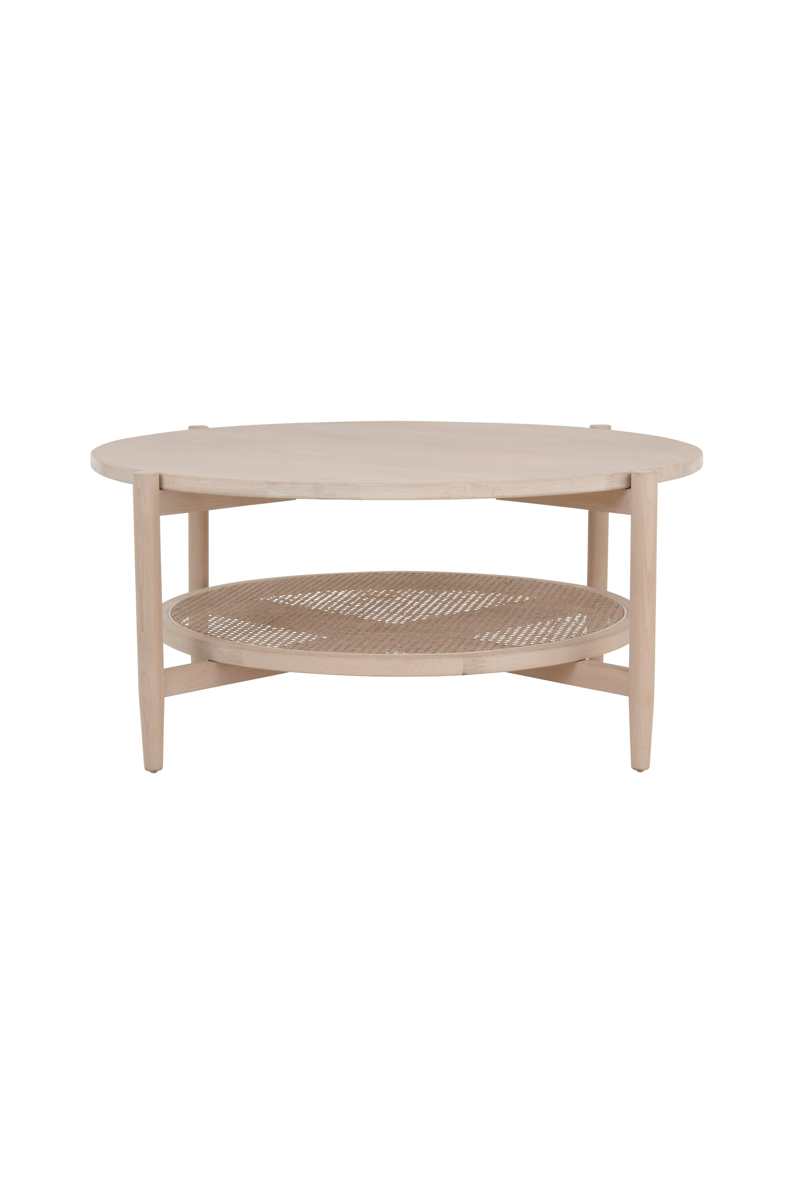 Runt soffbord med ett undre plan i rottingväv. Ben av massiv bok och toppskiva av bokfanerad MDF. Mått: Höjd 45 cm, Ø 108 cm. Det undre planet: Ø 80 cm. Höjd från golvet till det undre planet 12 cm. Höjd mellan det undre planet och toppskivan 19,5 cm.