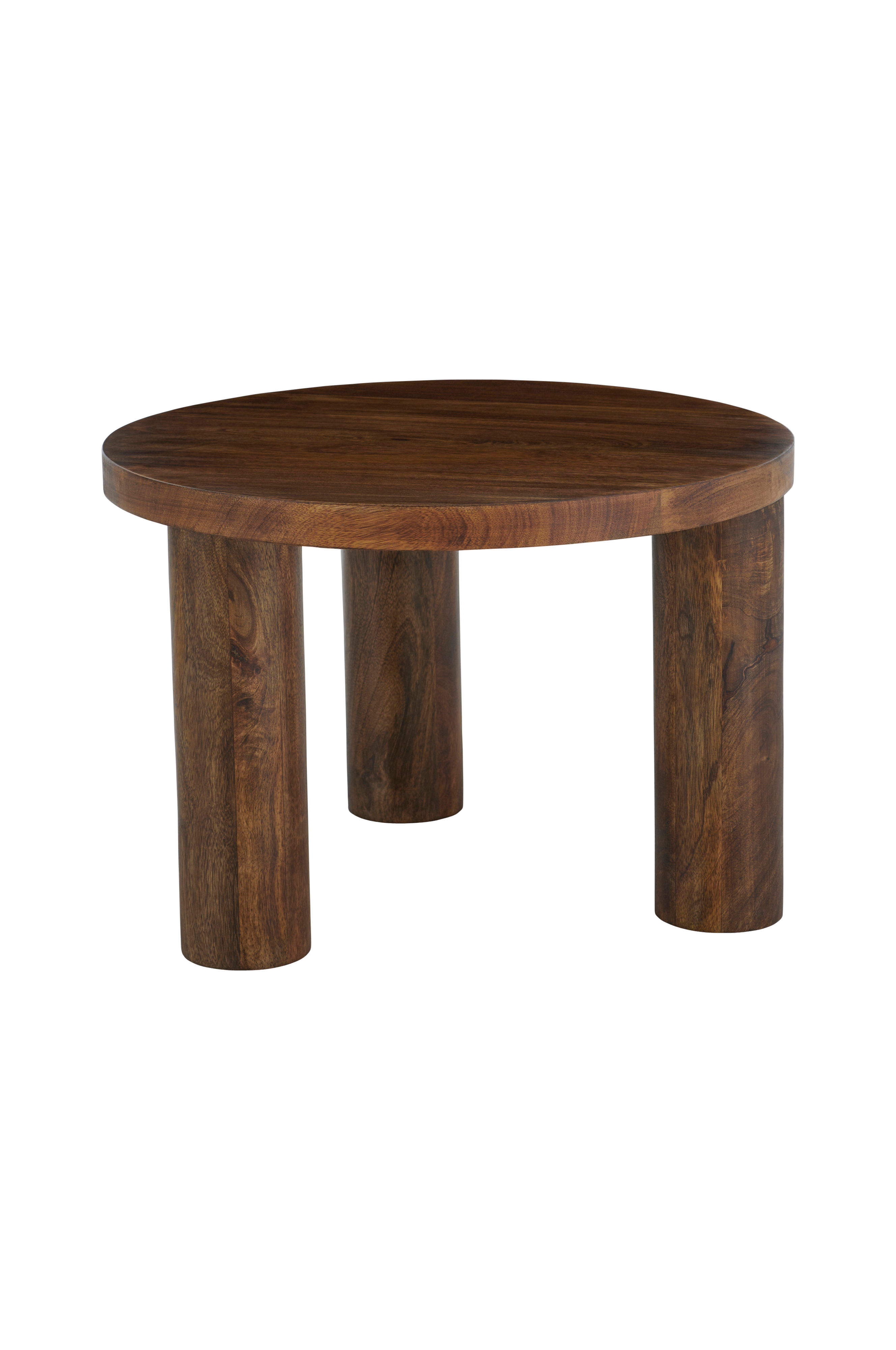 Runt soffbord i mangoträ med kraftiga, runda ben. Behandlat med matt lack. Höjd 41,5 cm, diameter på toppskivan 60 cm. Enklare montering.