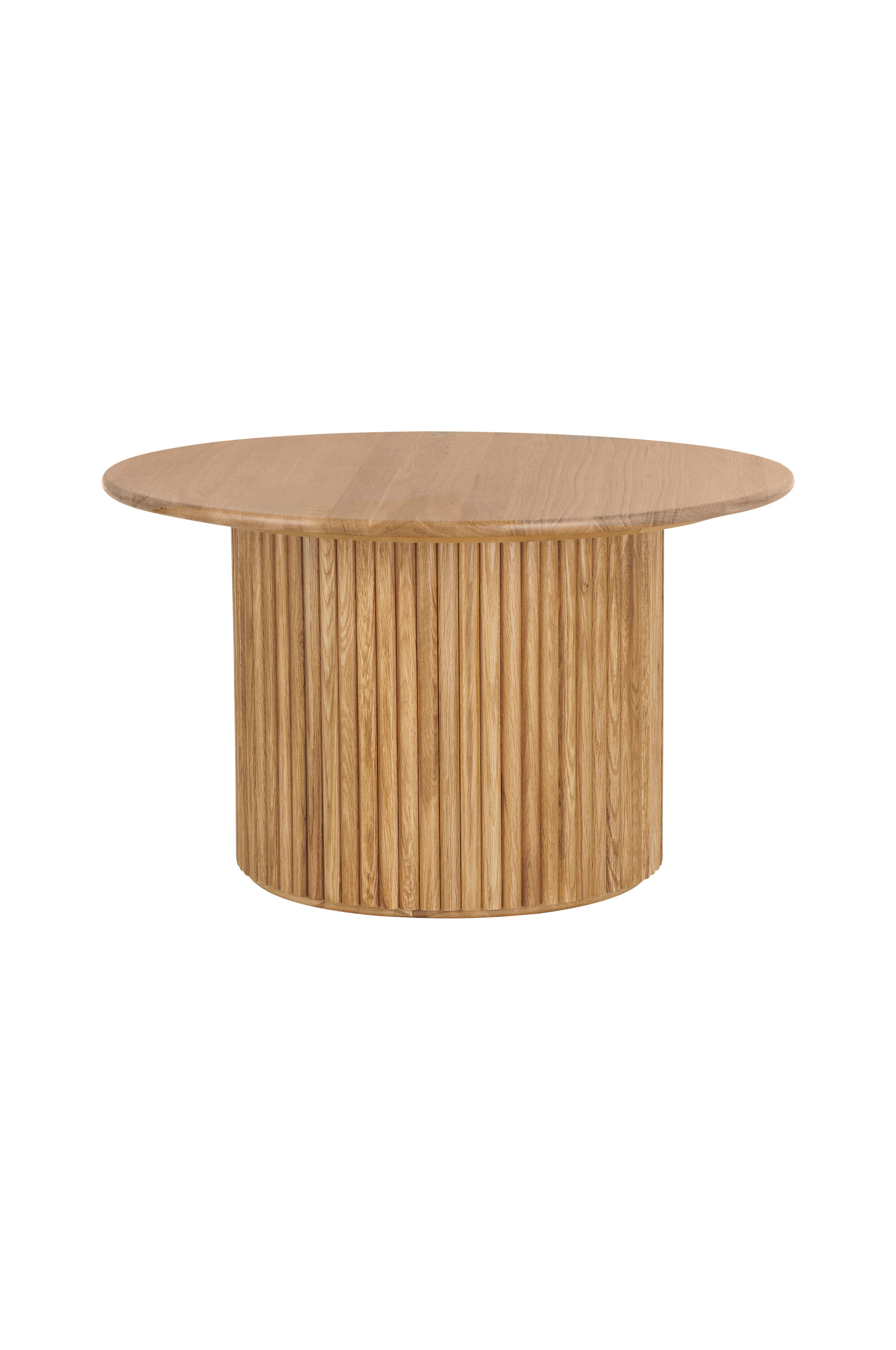Runt soffbord i massiv ek. Rund, stabil bas i massivt trä och MDF med monterade stavar runt om som ger basen en ribbad struktur. Behandlat med vattenbaserat lack. Höjd 48 cm, diameter på toppskivan ca 80 cm. Levereras omonterat.