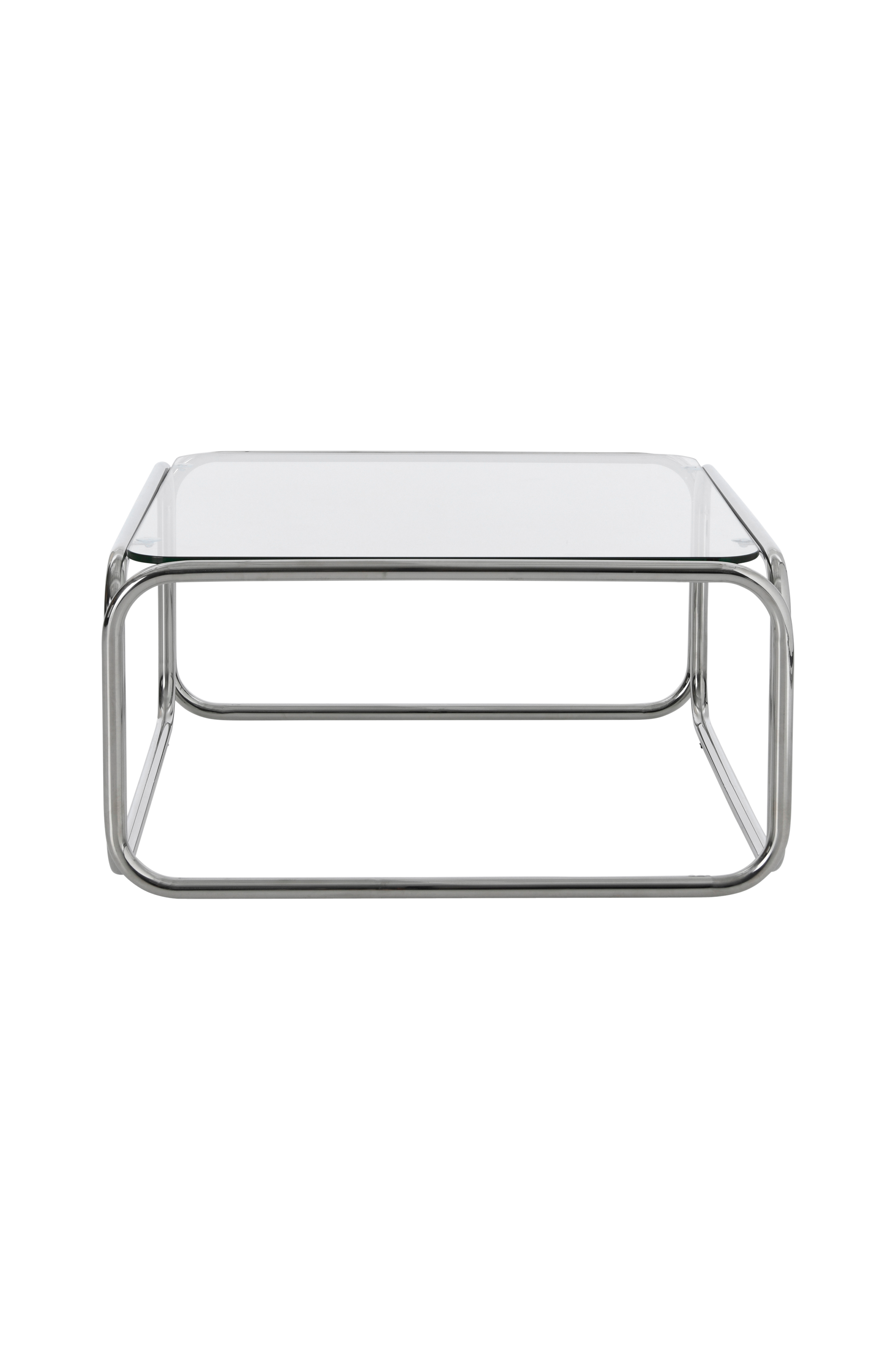 Soffbord med underrede i polerat rostfritt stål. Toppskiva i tempererat glas, tjocklek 10 mm. Max viktbelastning 50 kg. Skivan är avtagbar.