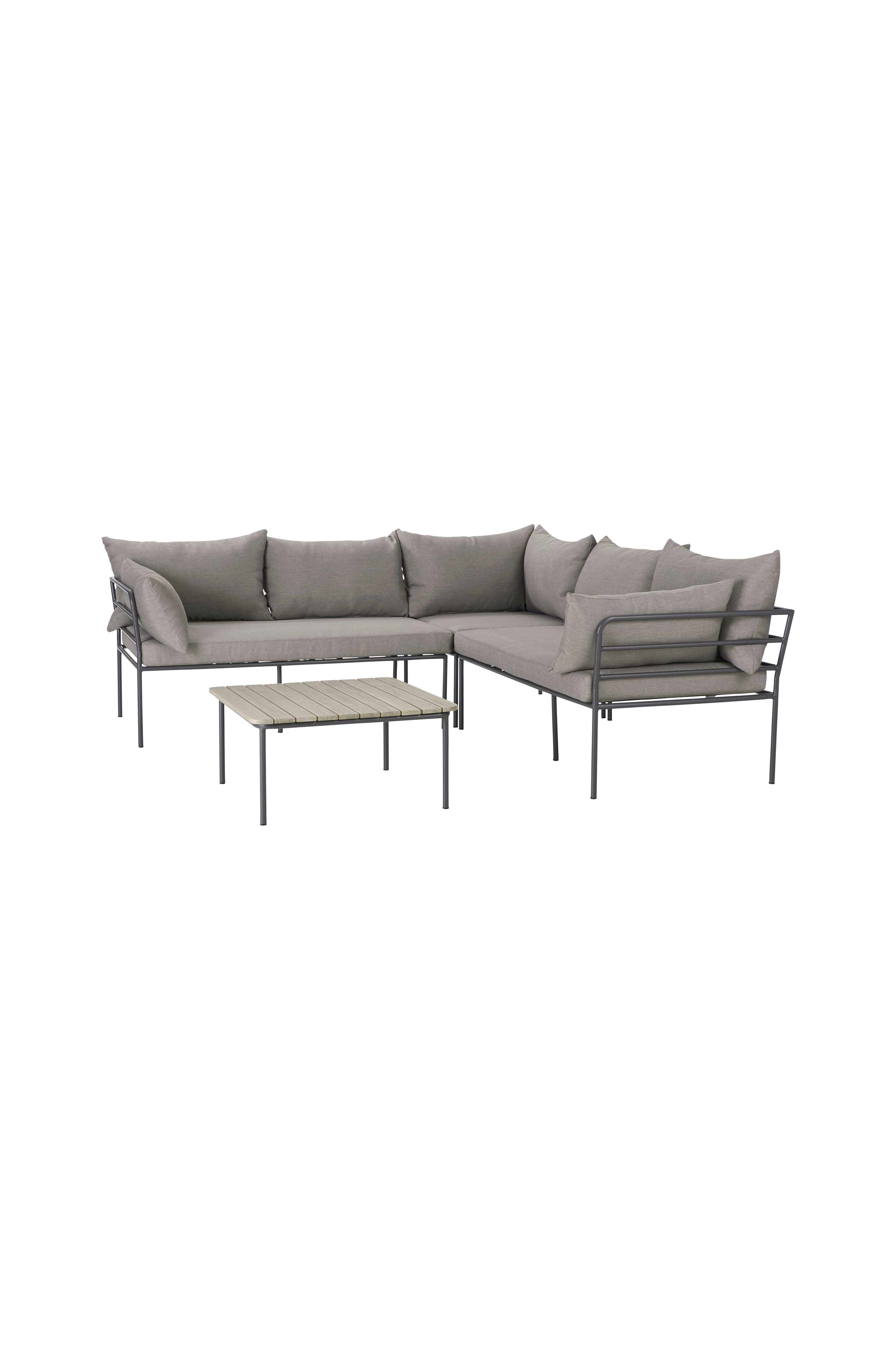 Soffa i loungemodell med ett soffbord. Soffan består av två 2-sitsdelar och en hörndel som ställs bredvid varandra eller fästs ihop (fästen medföljer ej).