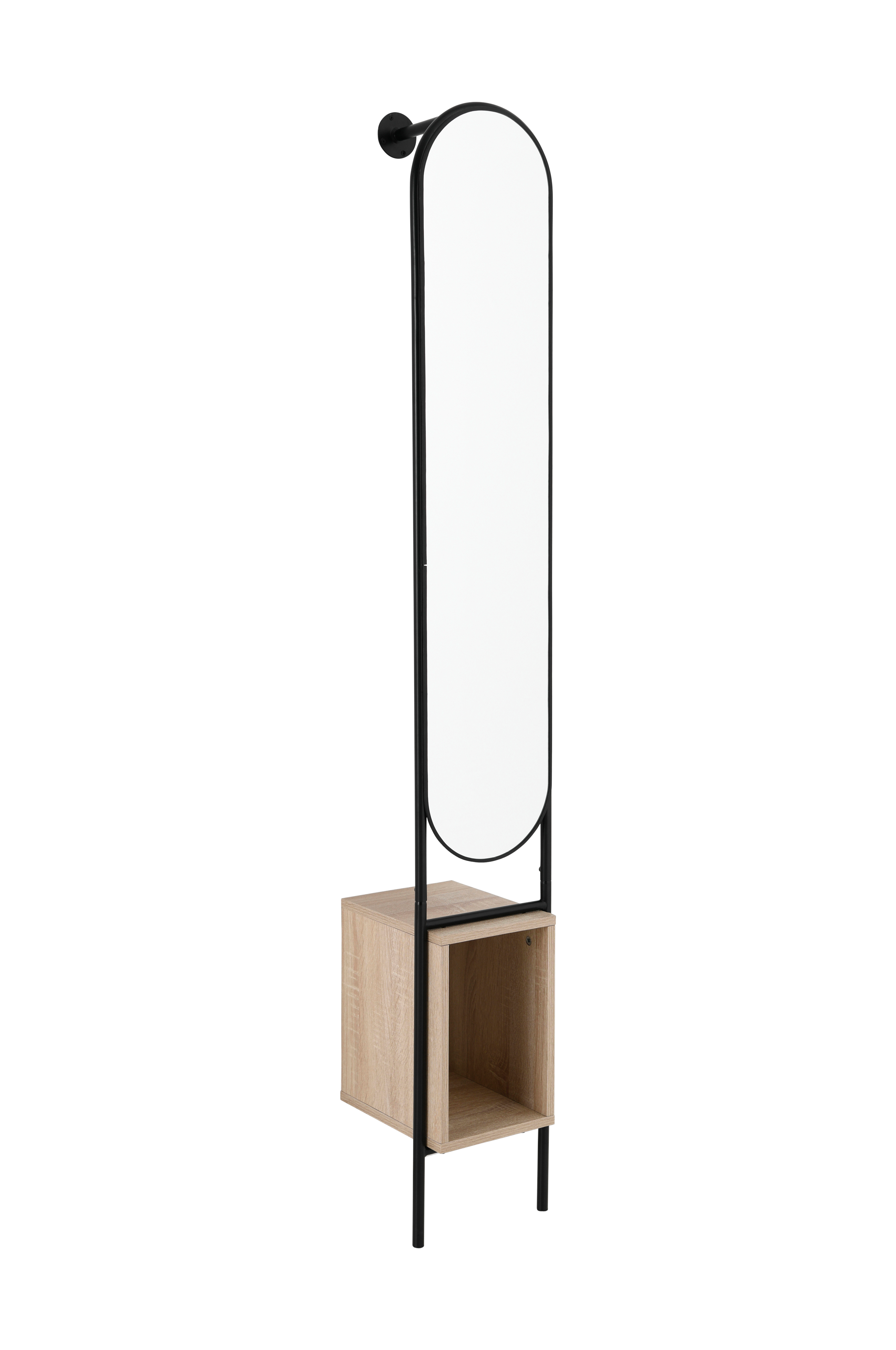 Spegel med med hängare av metall för klädgalgar på baksidan. Ram och hängare av pulverlackad metall Förvaringshylla i fanerad MDF.
