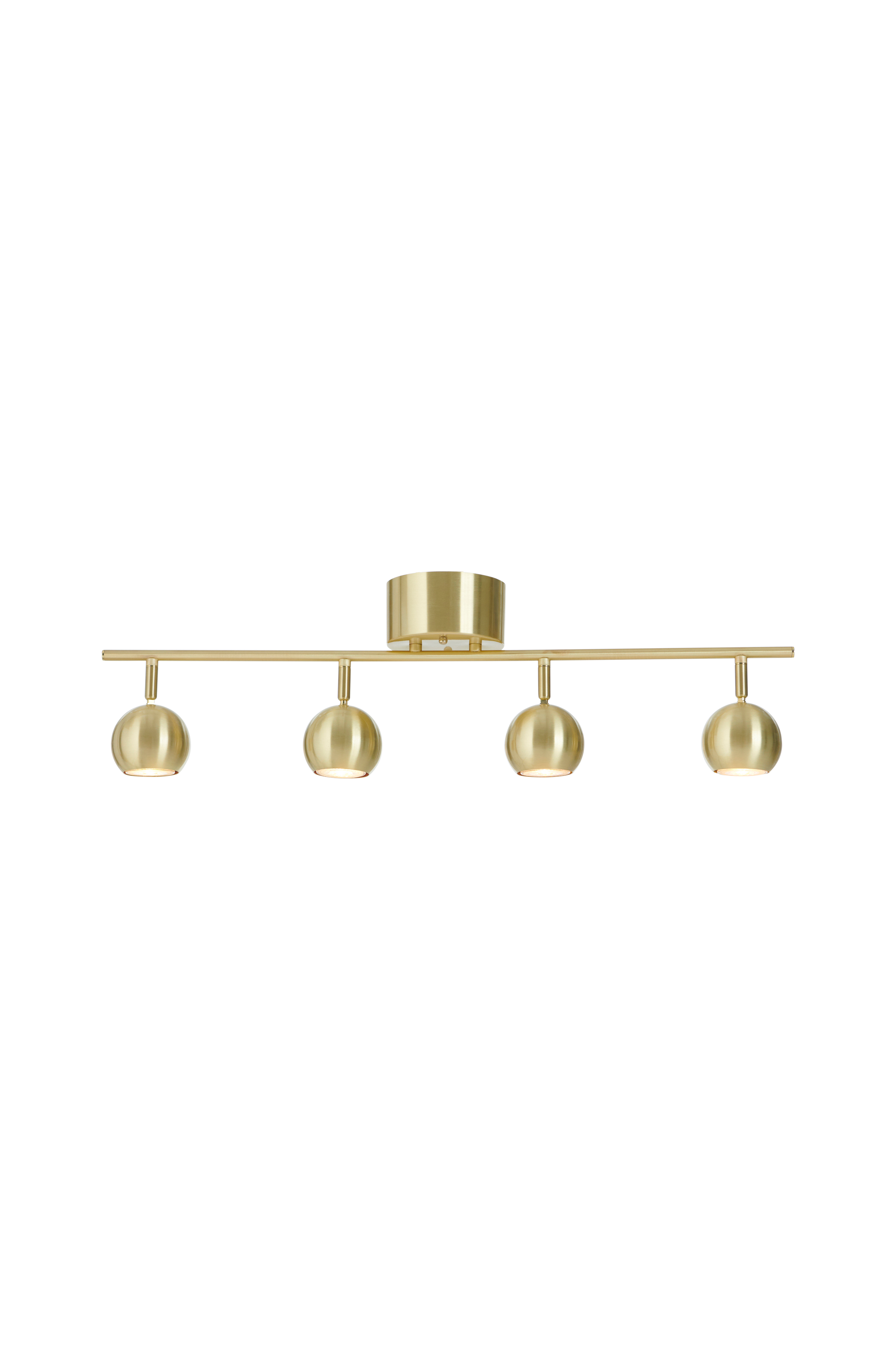 Spotskena med 4 spotlights som kan vinklas. Av metall med borstad mässingfinish. Mått på takkopp: Diameter 12 cm, höjd 6 cm. Krokupphängning. 10W LEDx4. Ljuskällor ingår ej. Jordad.