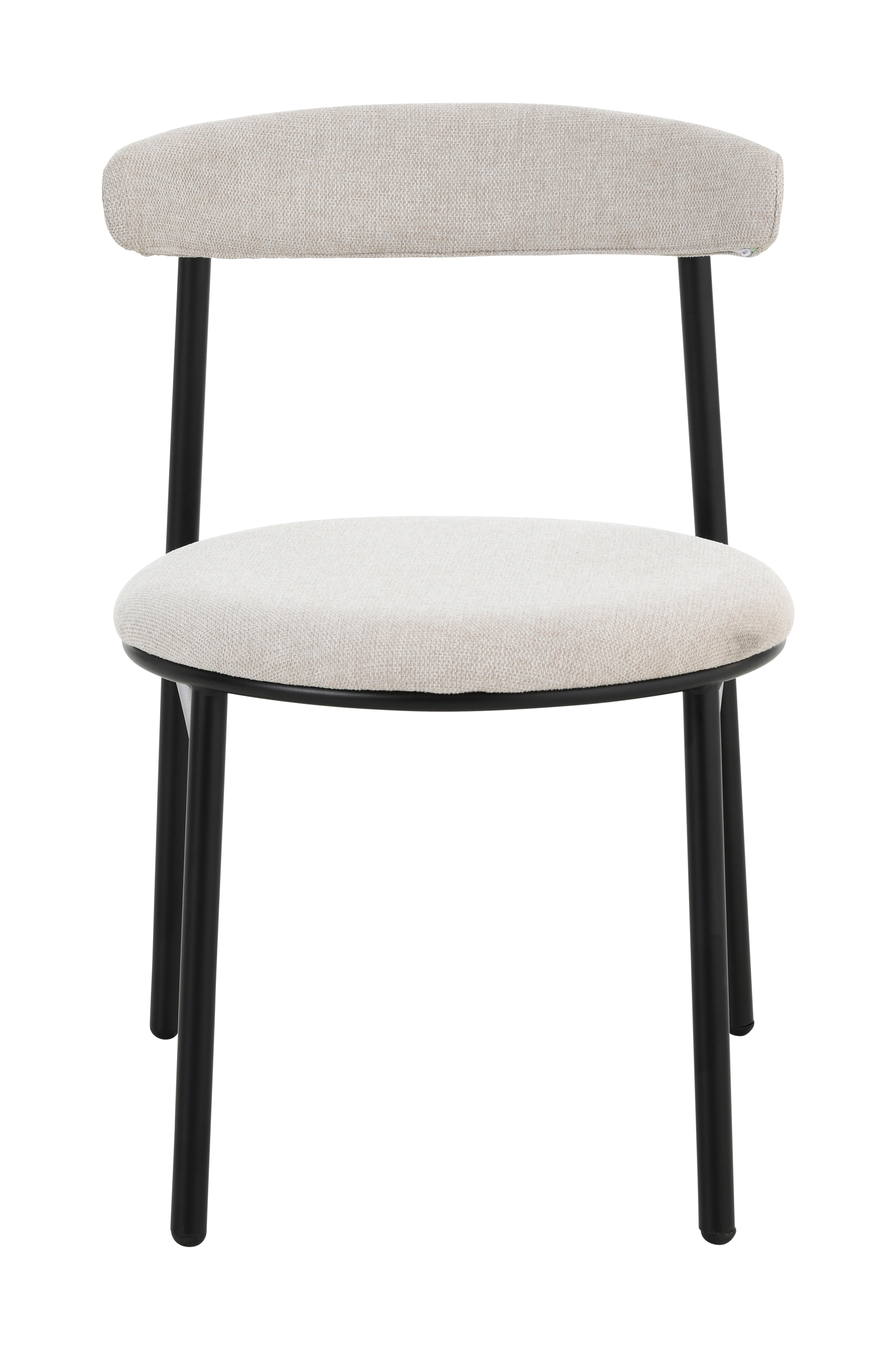 2 stolar i modern design med rund sits och svängd rygg. Stomme och ben i metall. Sits och rygg med skumfyllning. Enklare montering.