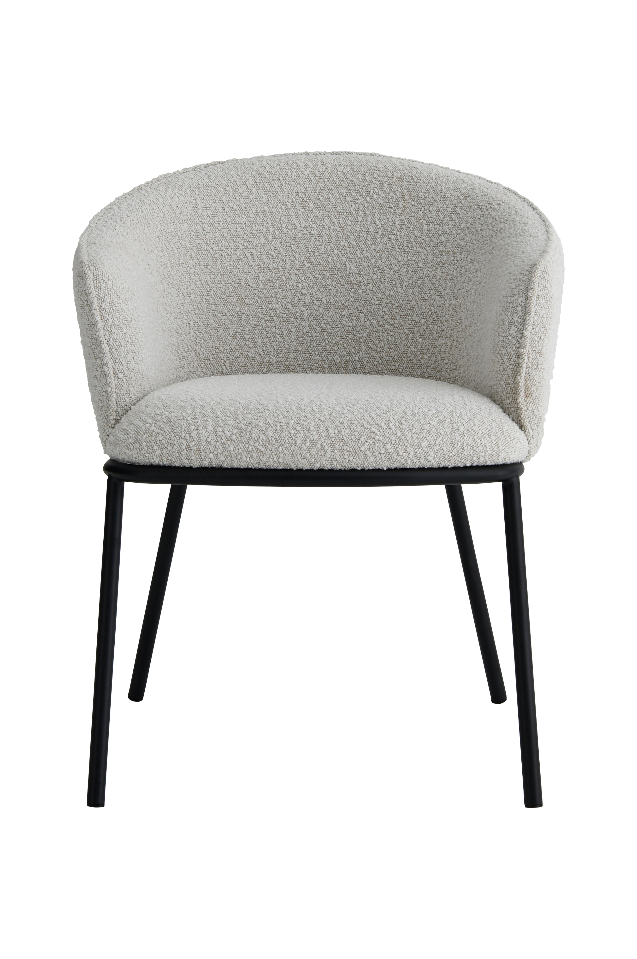 Stol med stoppad sits och rygg. Klädsel i bouclétyg med med passpoalkant upptill. Skumfyllning. Ben och stomme i pulverlackad metall. Enklare montering.