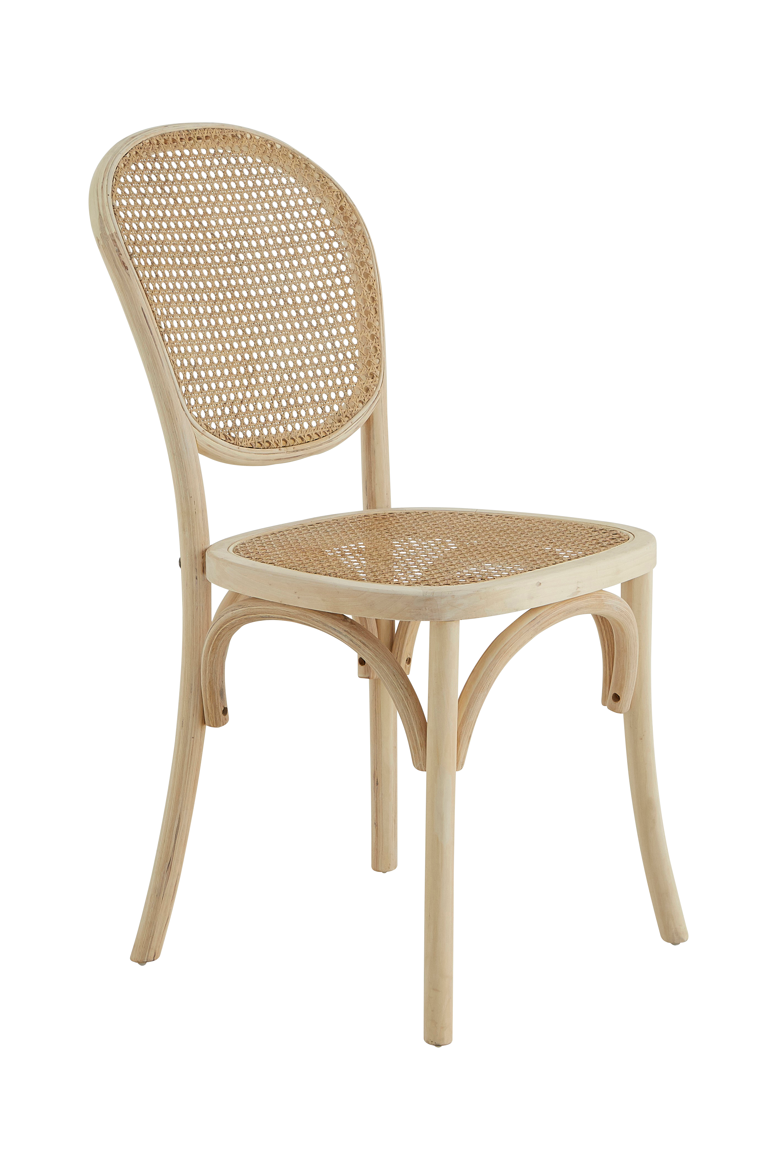 Två stolar av björk med rygg och förstärkt sits av rotting. Höjd 89 cm, bredd 44,5 cm, djup 56 cm. Sittdjup 42 cm, Sitthöjd 46,5 cm. Monterade. Vikt 10 kg.