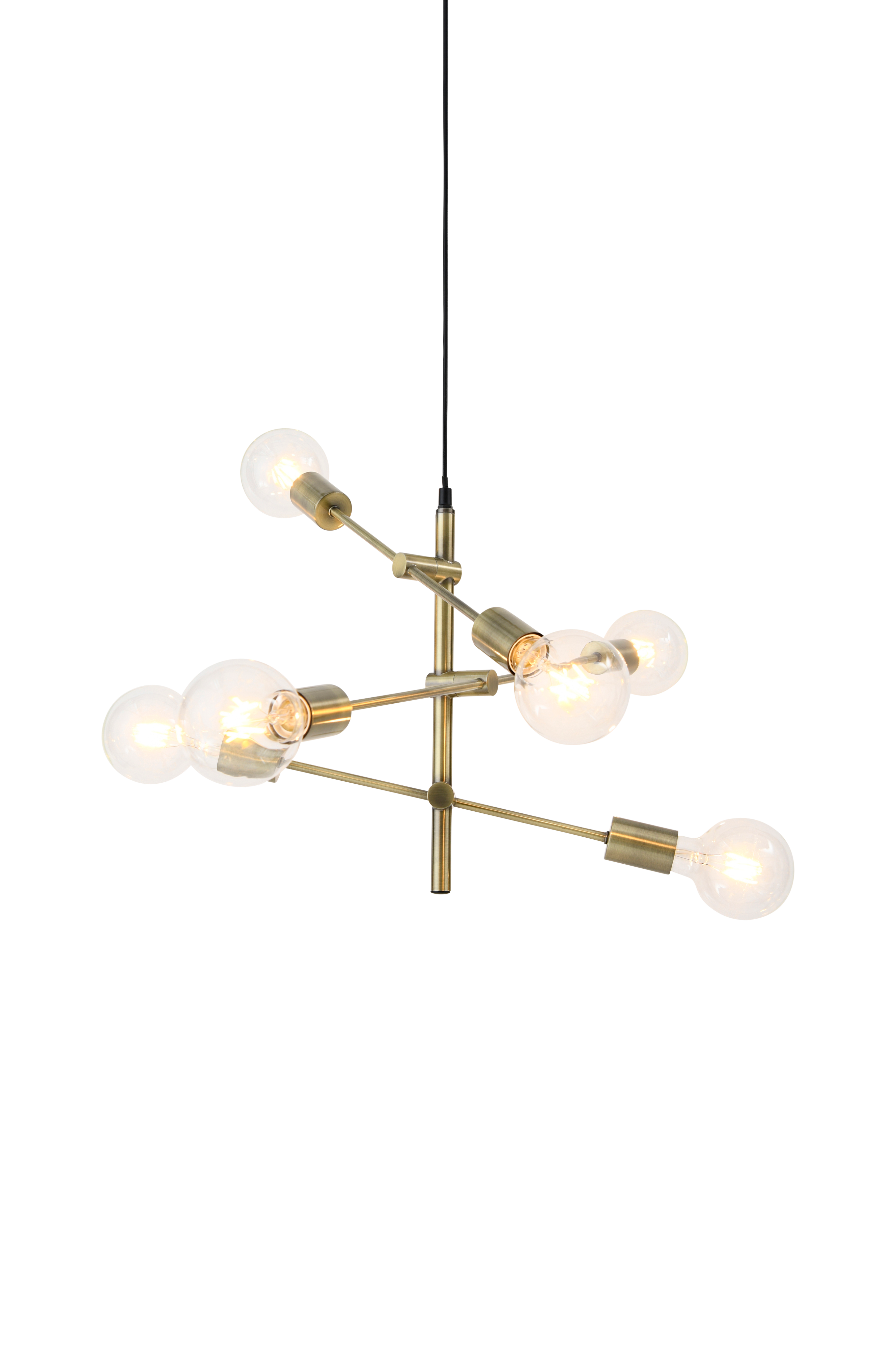 Taklampa av metall med 3 armar. Armarna skruvas fast till sin position och kan vinklas. Reglerbar längd på sladden, maxhöjd från takkoppen till nederkanten på lampan 131 cm. Två armar är 45 cm långa och en arm är 70 cm lång. Takkopp i metall med krokupphäng. Stor sockel 6 x E27, max 40 W. Ljuskällor ingår ej.