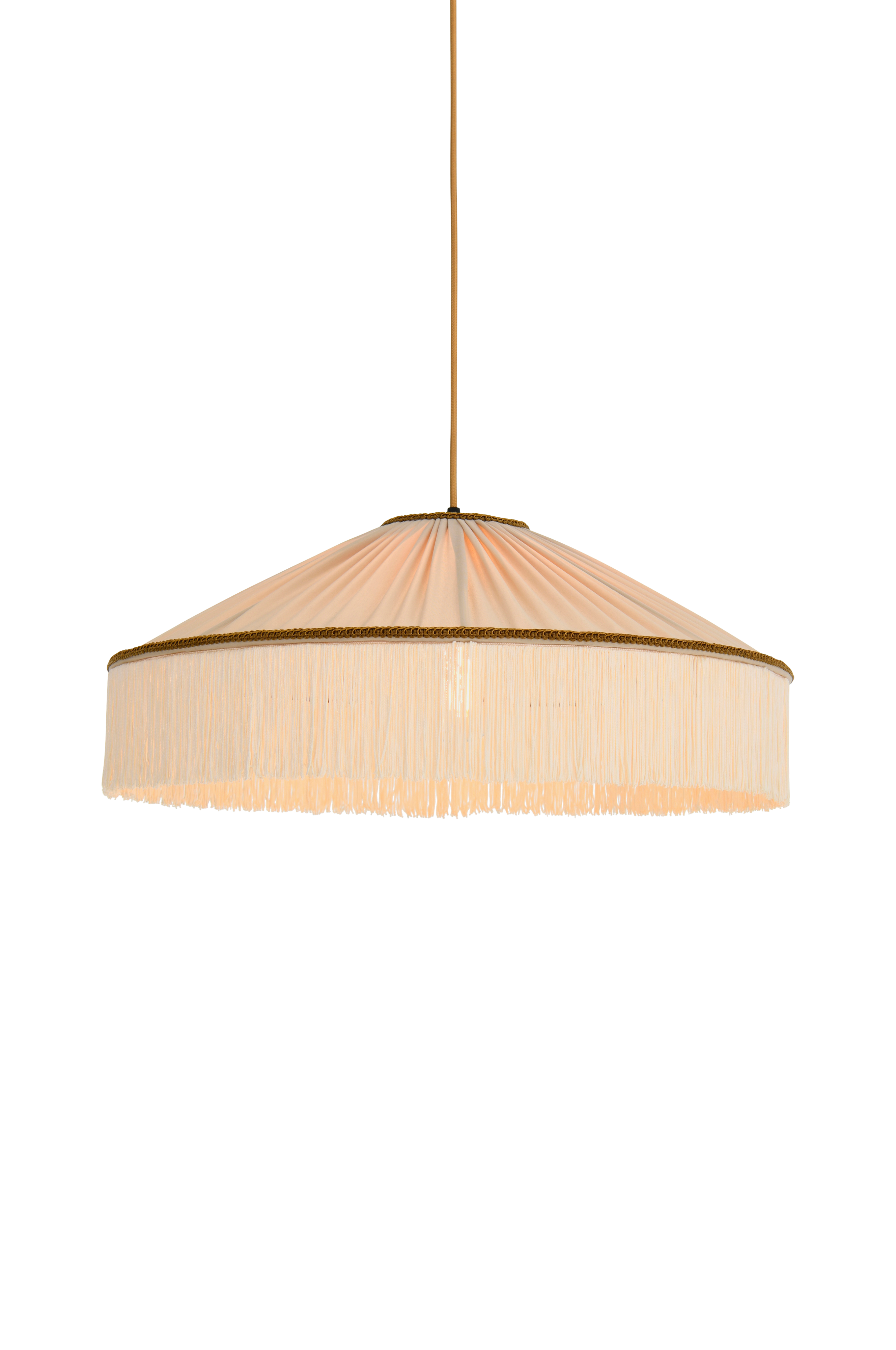 En stämningsfull taklampa som utstrålar exklusivitet. Taklampan har en skärm av veckad textil och fransar med vacker lyster och extra detaljer med broderade band i kontrasterande färg. Totalhöjd ca 120 cm. Guldfärgad textilsladd. Svart takkopp av plast. Monteras med krokupphäng. Ljuskälla ingår ej. Ojordad.