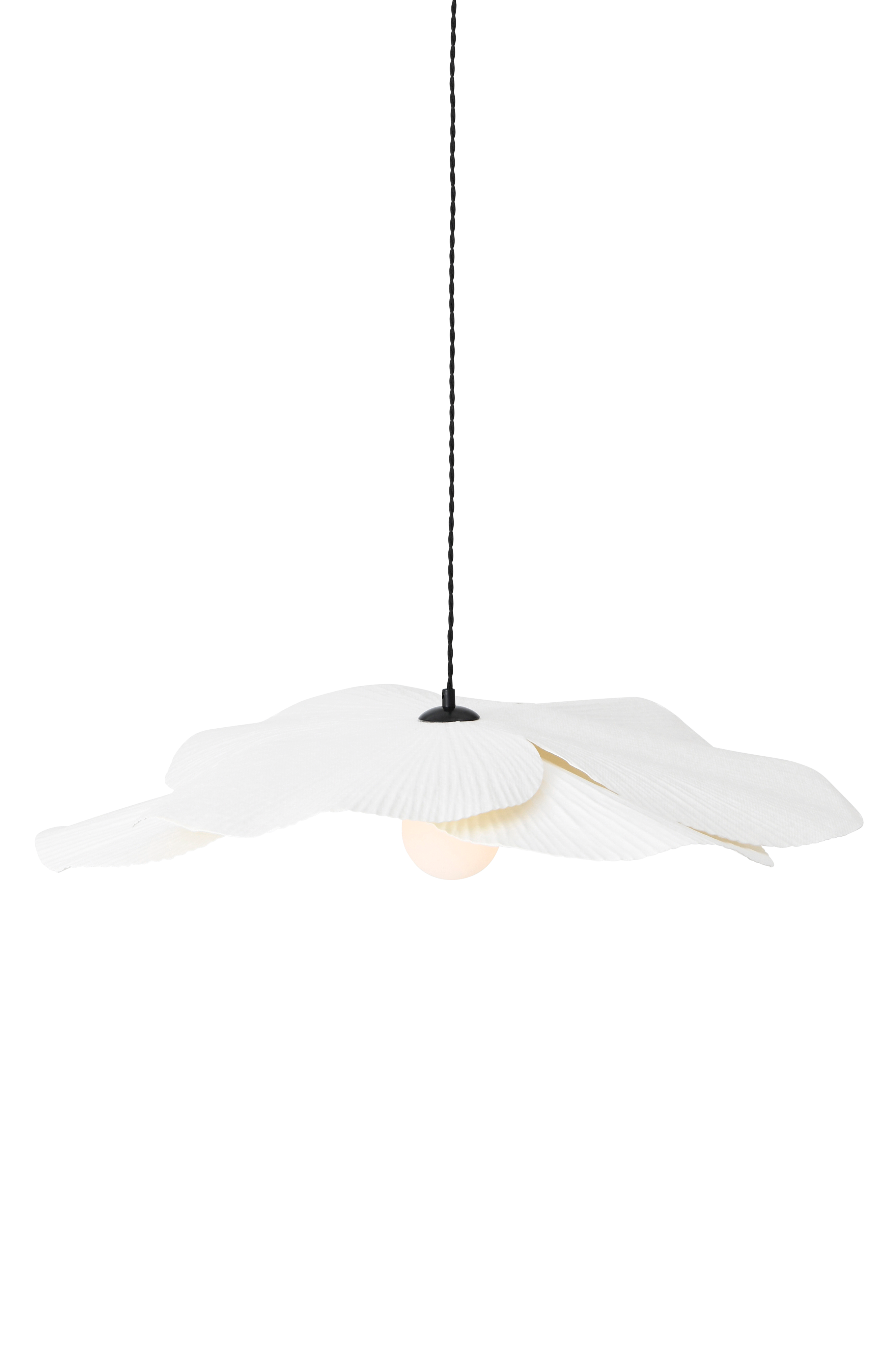 Taklampa i oblekt papper med kronbladliknande form, tillverkad i papier-maché-teknik. Total höjd från tak ca 145 cm, kan kortas till önskad höjd. Svart textilsladd och svart takkopp. Monteras med krokupphäng. Taklampan är handgjord och därför unik i sin form.