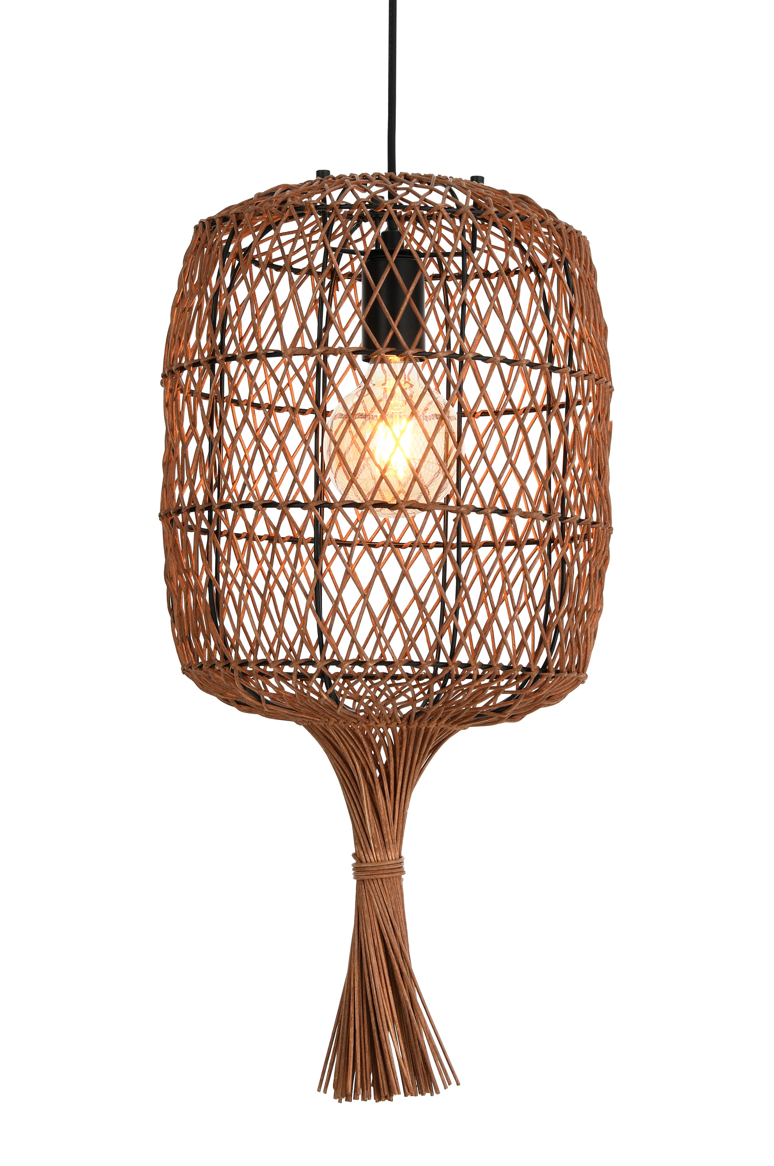 Taklampa med skärm i brunfärgad rotting. Svart textilsladd. Total takhöjd ca 190 cm, kan kortas till önskad höjd. Svart takkopp i plast. Monteras med krokupphäng. Ljuskälla ingår ej. Ojordad.