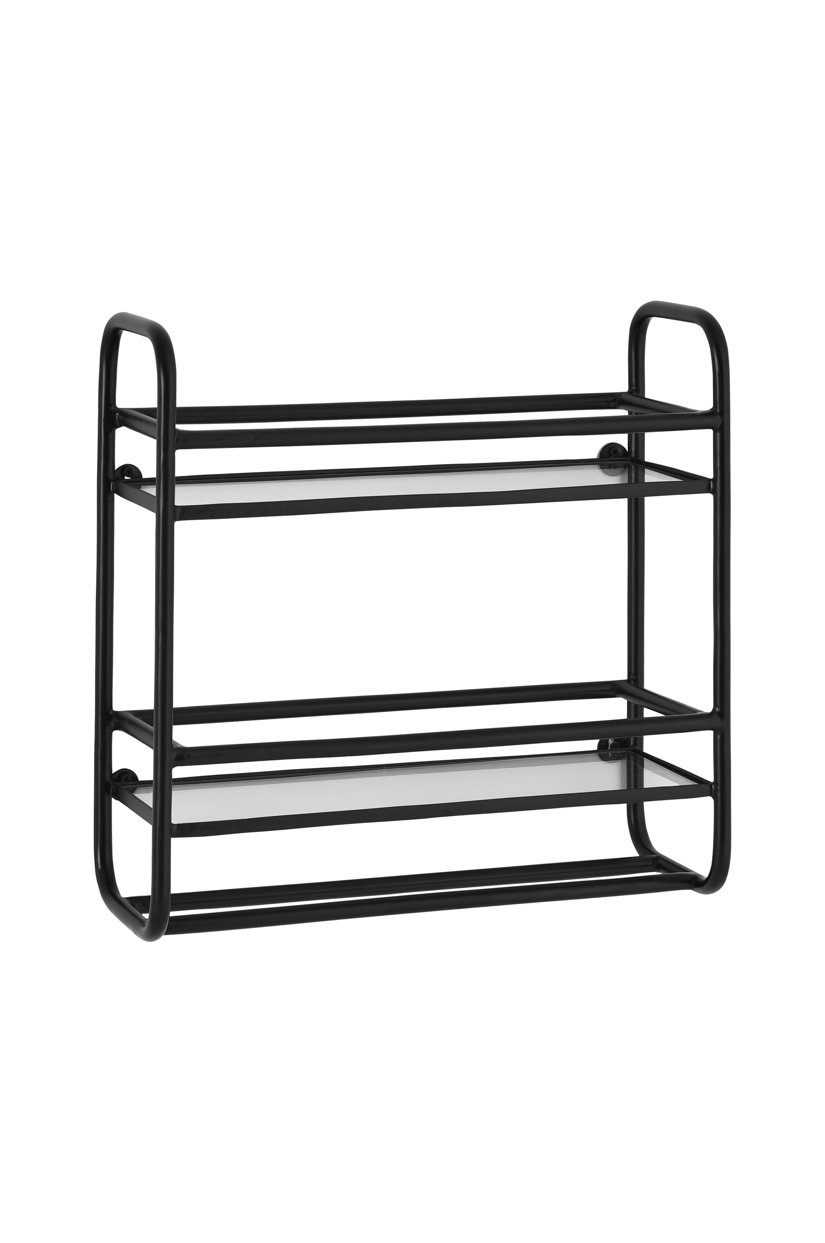 Vägghylla i pulverlackad metall med 2 hyllplan i klarglas. Hyllplanens tjocklek 4 mm. Mått på hyllplan 40x14 cm. Väggupphängning på baksidan med 4 fästen.