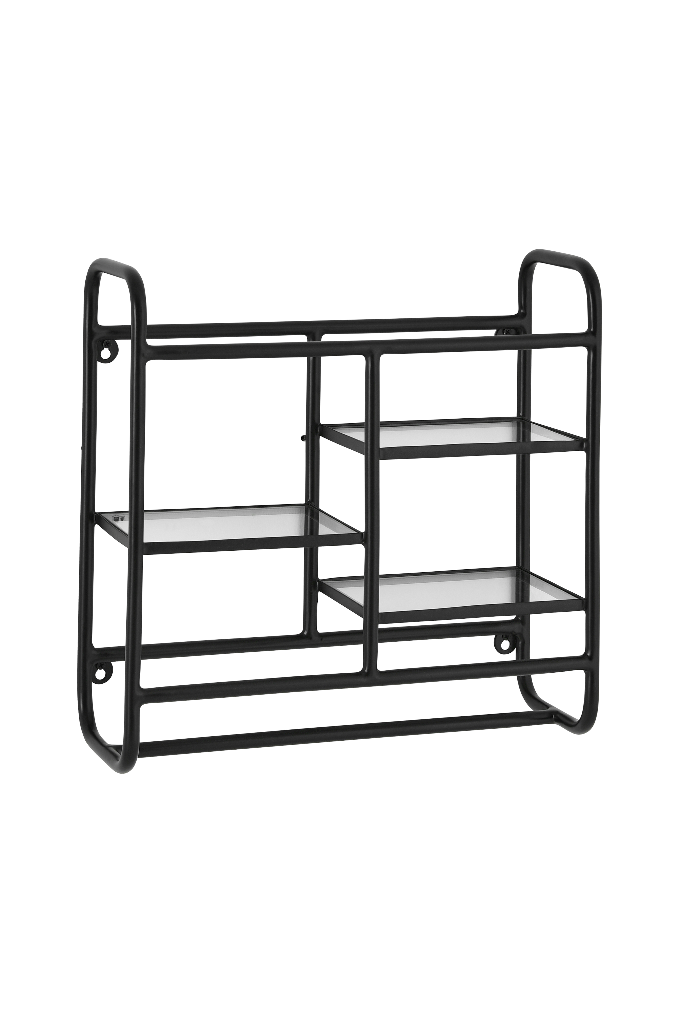 Vägghylla i pulverlackad metall med 3 hyllplan i klarglas. Hyllplanens tjocklek 4 mm. Den nedre stången kan användas som klädhängare. Avsedd för väggupphängning med 4 fästen på baksidan.