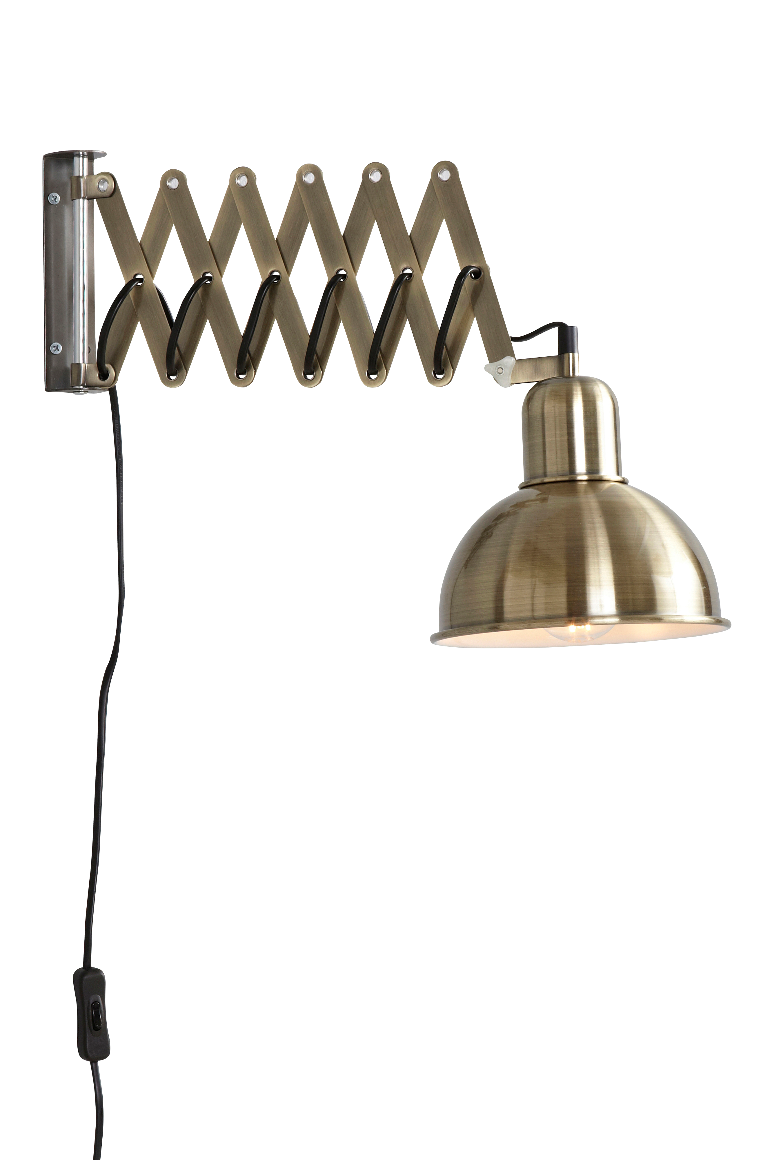 Vägglampa i metall med flexibel vrid- och utdragbar arm. Höjd 30 cm. E27. Max 25W. Armen kan dras ut från 15 cm till 58 cm. Skärm Ø 18 cm.