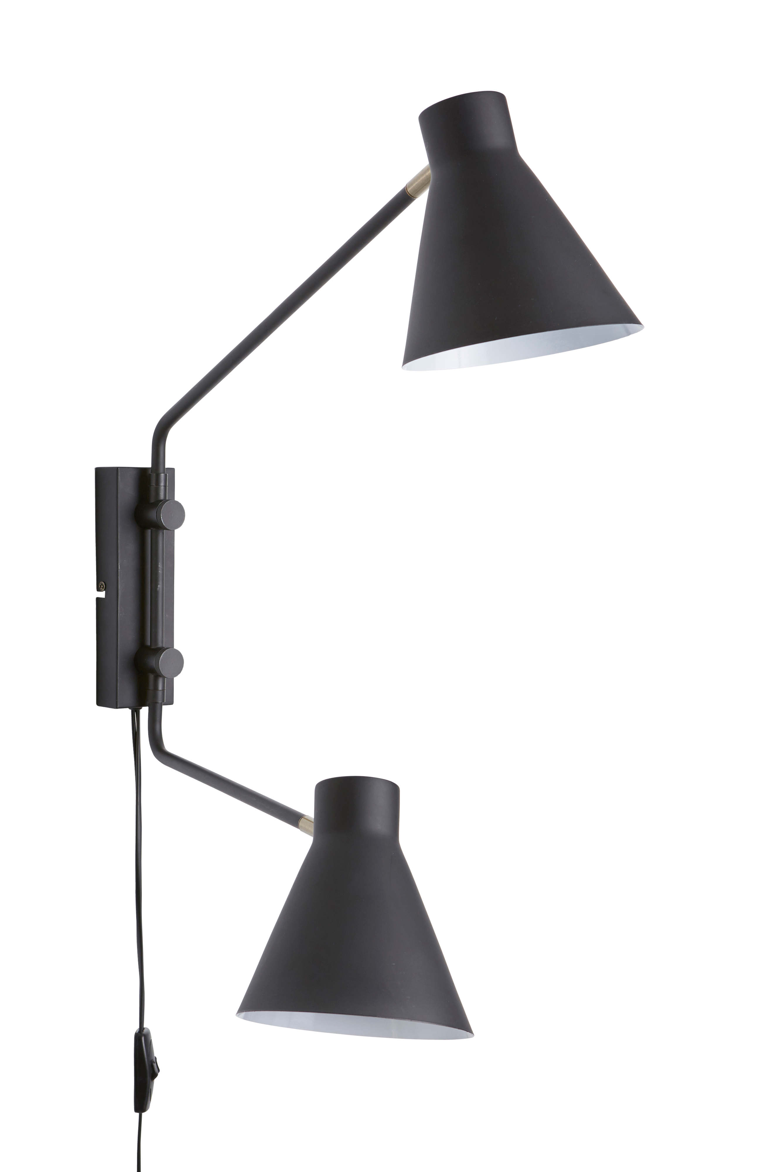 Vägglampa i matt metall med två armar, justerbara i sidled. Längst ut på armarna finns detaljer i antikmässing. Justerbara skärmar i höjd- och sidled med vit insida. Lamporna kan tändas och släckas var för sig.