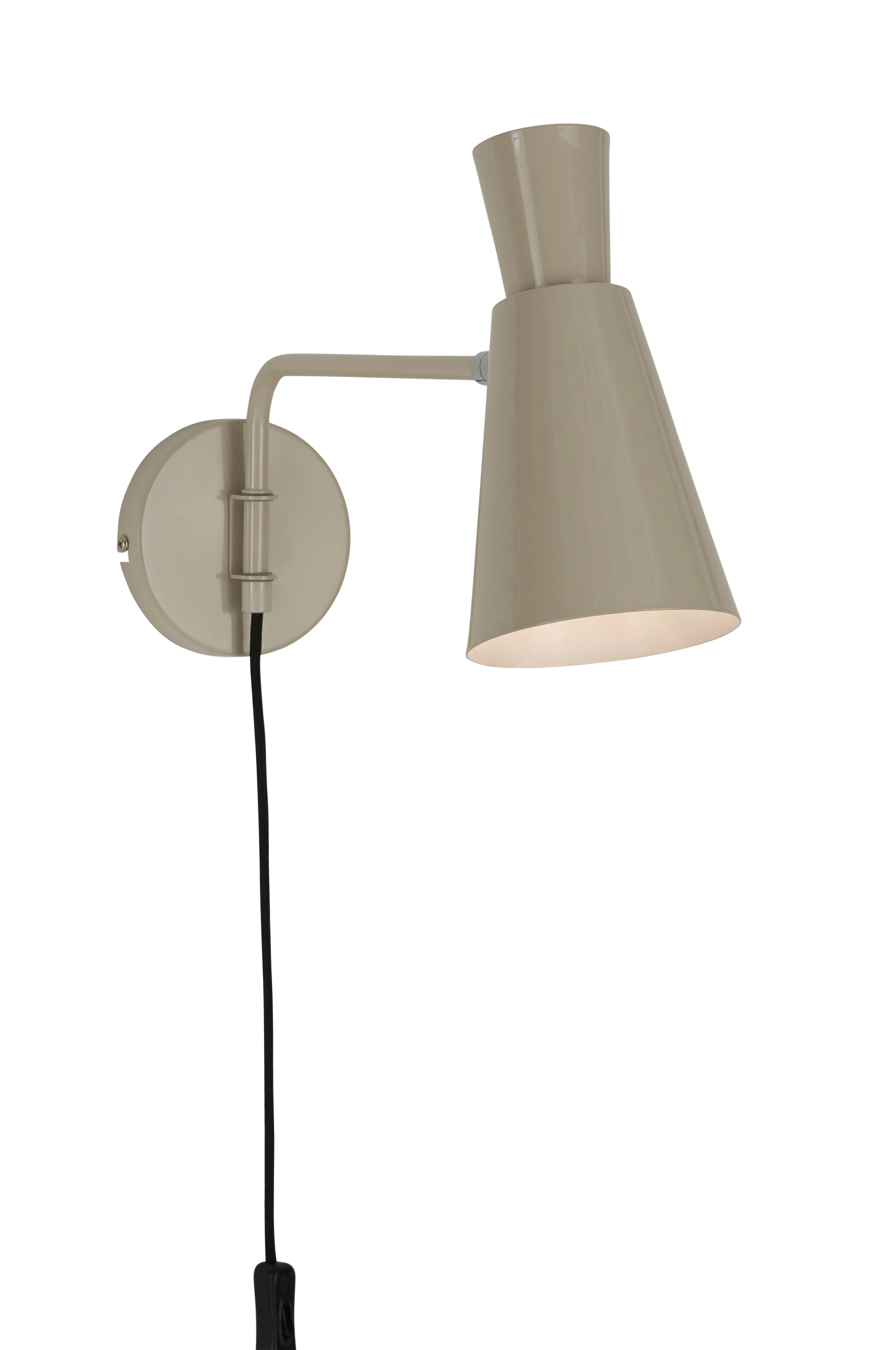 Vägglampa i metall. Armen är svängbar i sidled och skärmen är justerbar i höjdled. Mått på skärm: Diameter 12 cm, höjd 22 cm. Djup från vägg 45 cm. Väggplattans mått: Diameter 12 cm, höjd 2,5 cm. Svart textilsladd med strömbrytare och väggkontakt. Sladdlängd 180 cm. Sockel E27. Max 25W. Ljuskälla ingår ej.