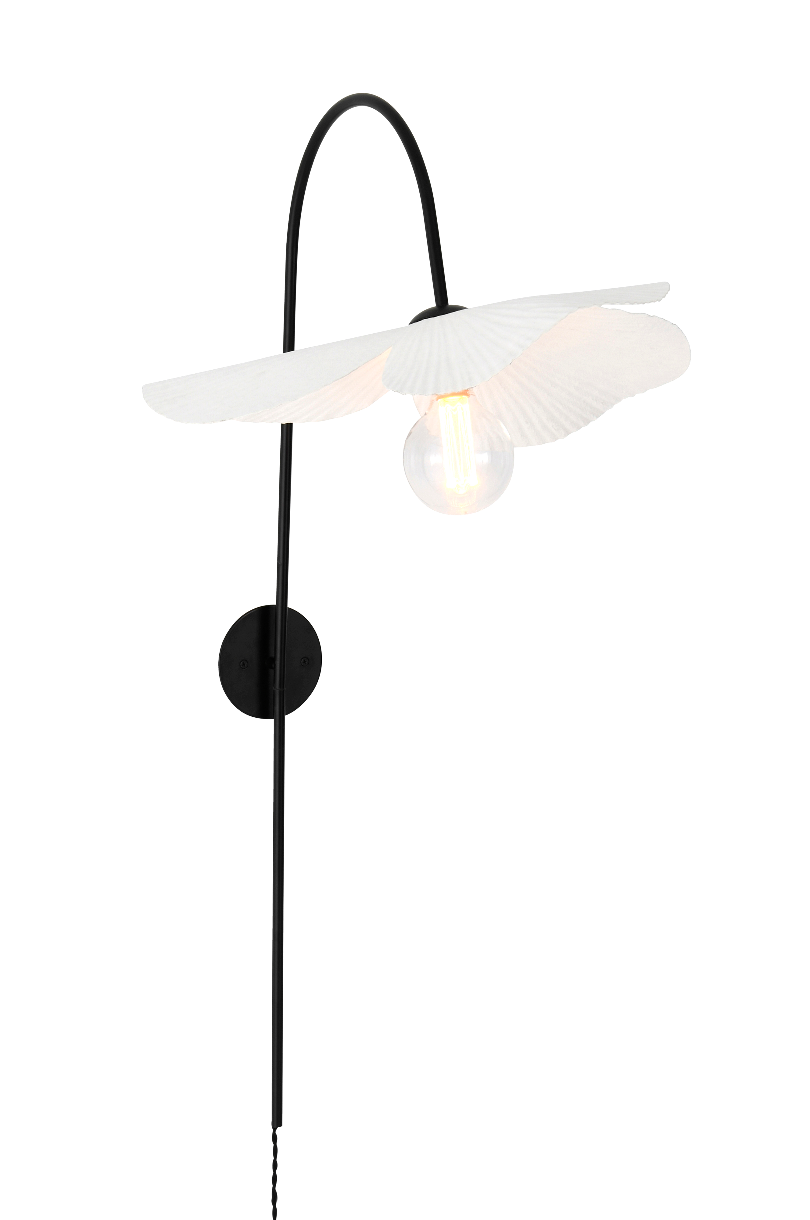 Vägglampa i metall med skärm av återvunnet papper. Skärmens diameter ca 49 cm. Väggplattans diameter ca 11 cm och höjd 2,5 cm. Svart, tvistad textilsladd med strömbrytare.