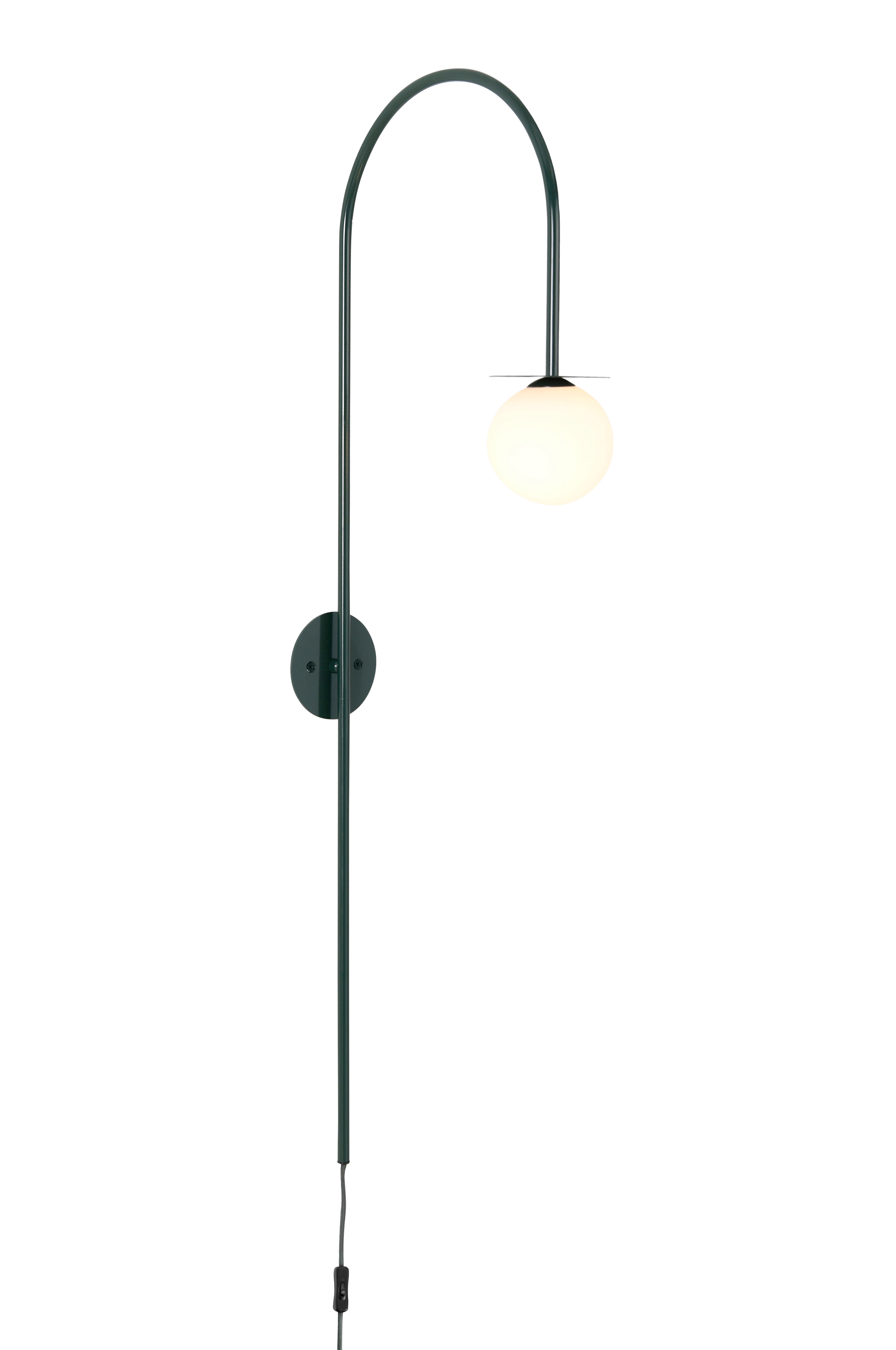 Vägglampa i metall med kupa i opalvitt glas. Kupan fästs och lossas genom skruvfunktion. Väggplattans diameter 10 cm, glaskupans diameter 9 cm. Textilsladd med strömbrytare och väggkontakt.