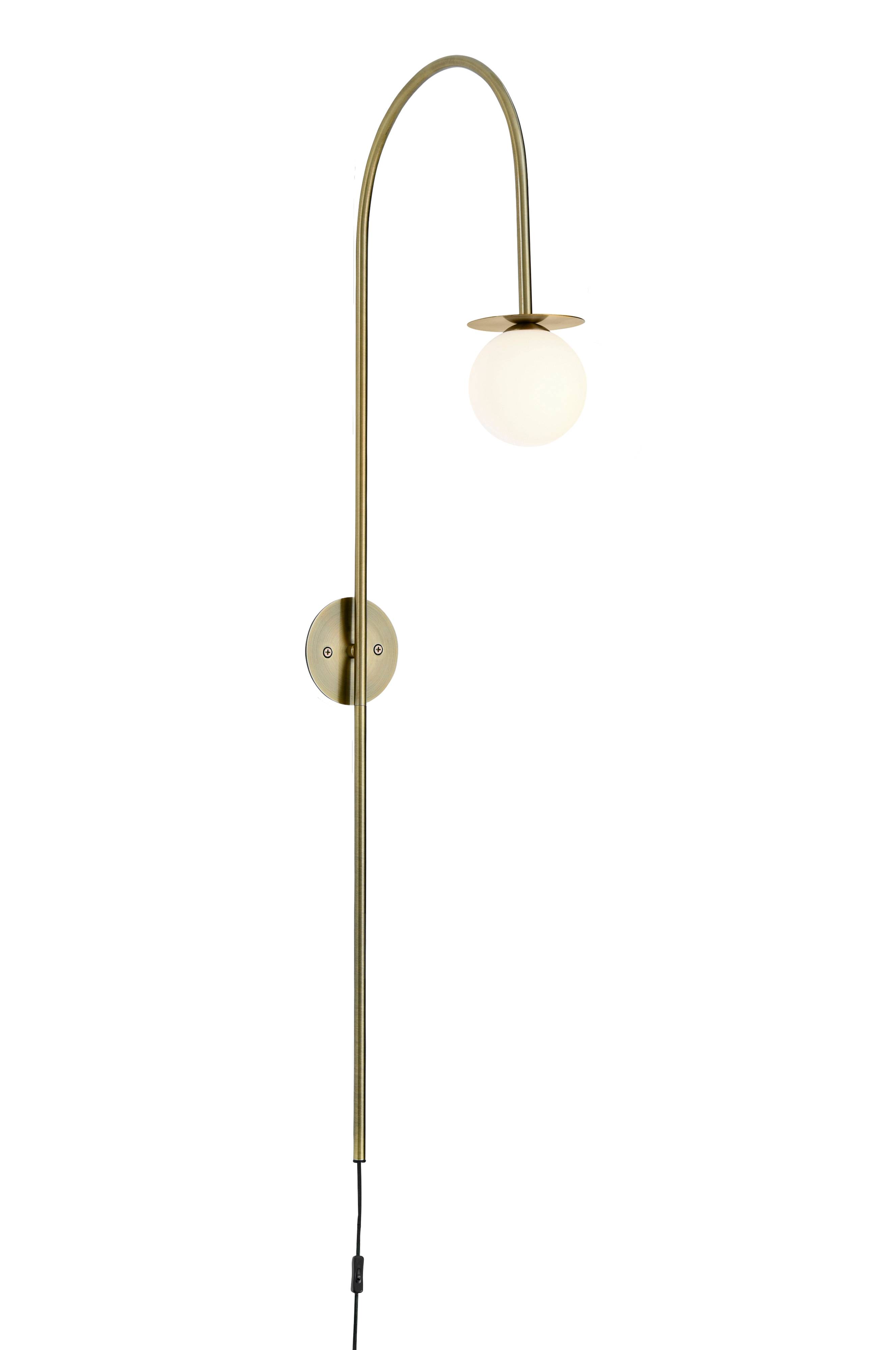 Vägglampa i metall med kupa i opalvitt glas. Kupan fästs och lossas genom skruvfunktion. Väggplattans diameter 10 cm, glaskupans diameter 9 cm. Textilsladd med strömbrytare och väggkontakt.