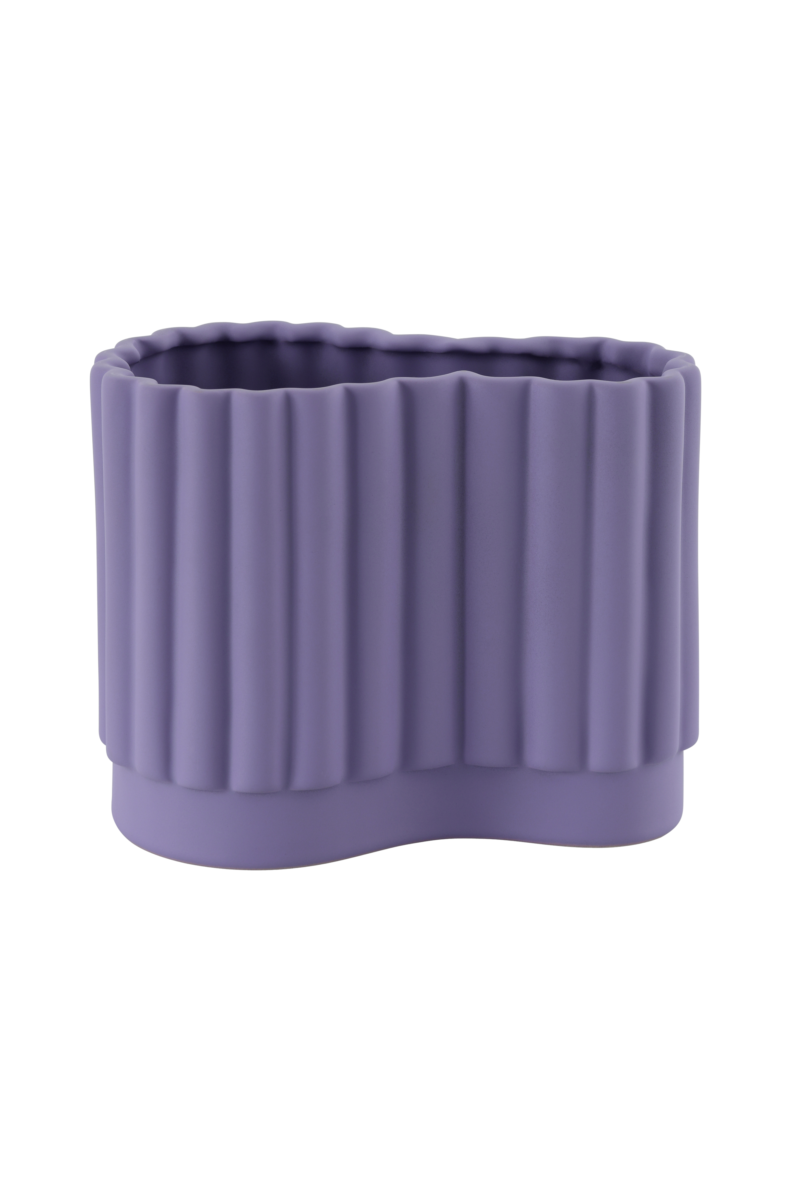 Dekorativ kruka eller vas av stengods i asymmetrisk form med ribbstruktur. Vattentät.