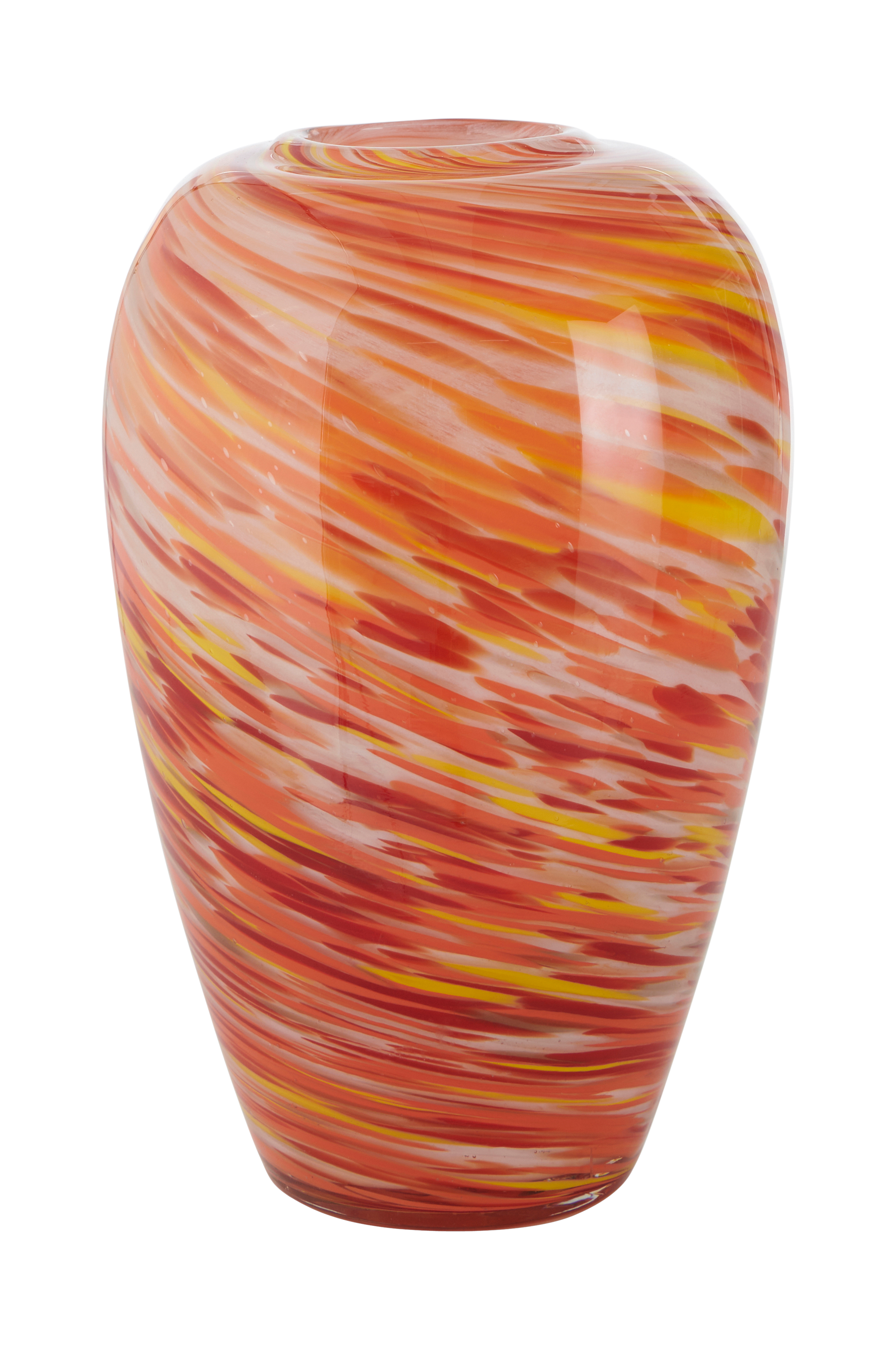 Dekorativ vas av glas. Största diameter ca 19 cm. Innerdiameter öppningen 7,5 cm.