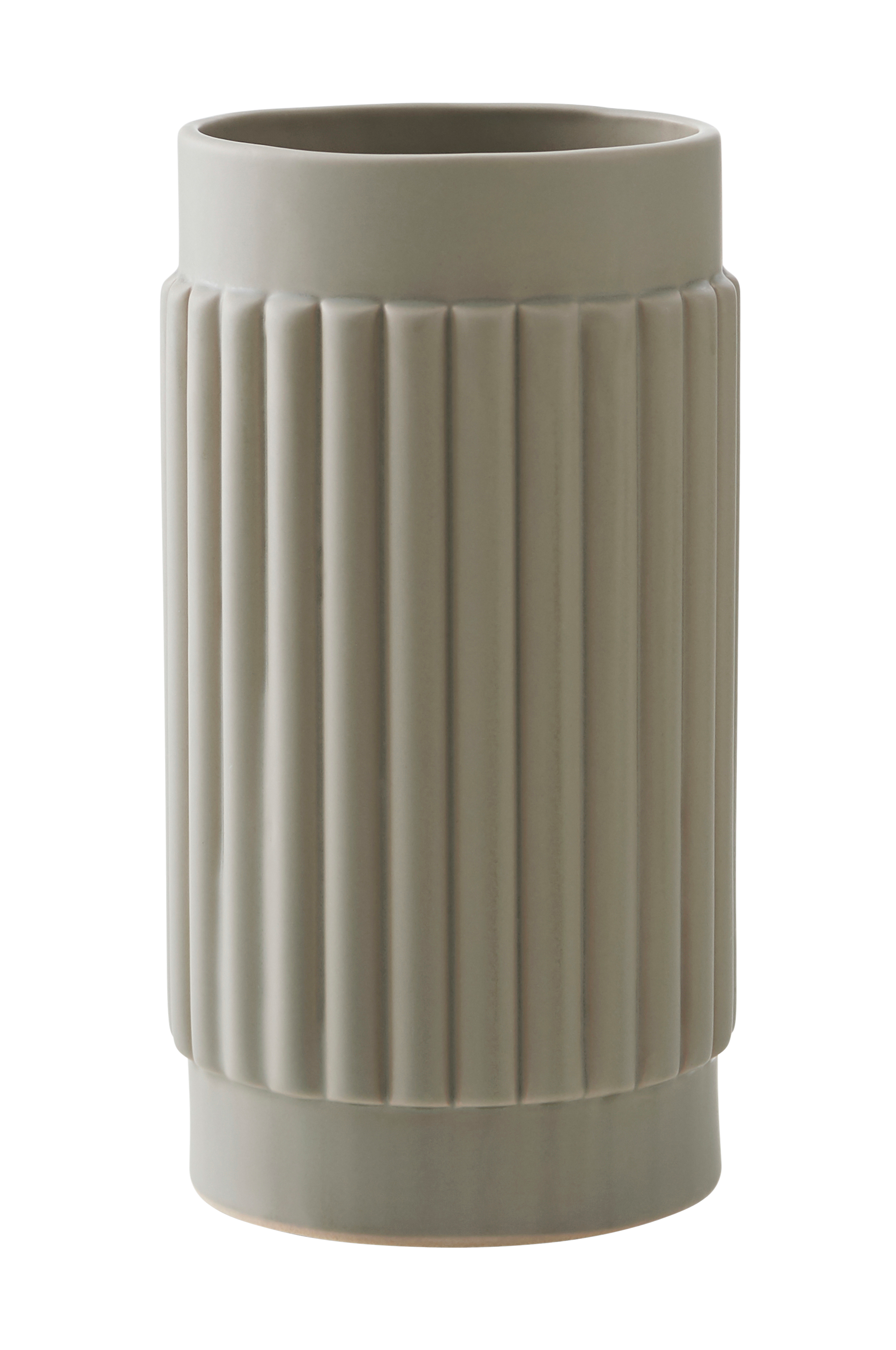 Vas av stengods med ribbat strukturmönster. Höjd 26 cm. Diameter upptill 12 cm, diameter som störst 14 cm.