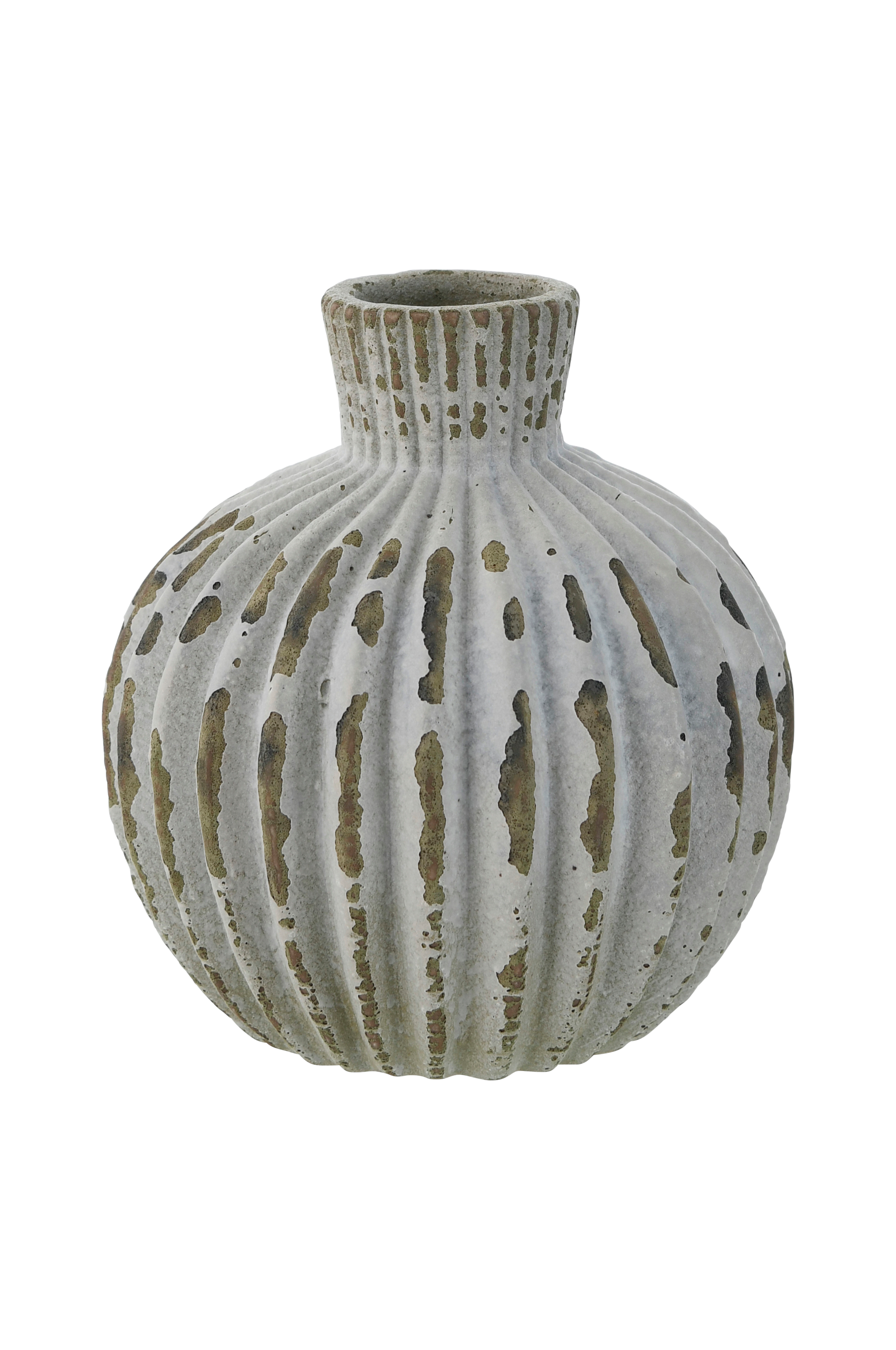 Vas i keramik med patinerad finish. Största diameter 16 cm. Innerdiameter öppningen 4,5 cm.