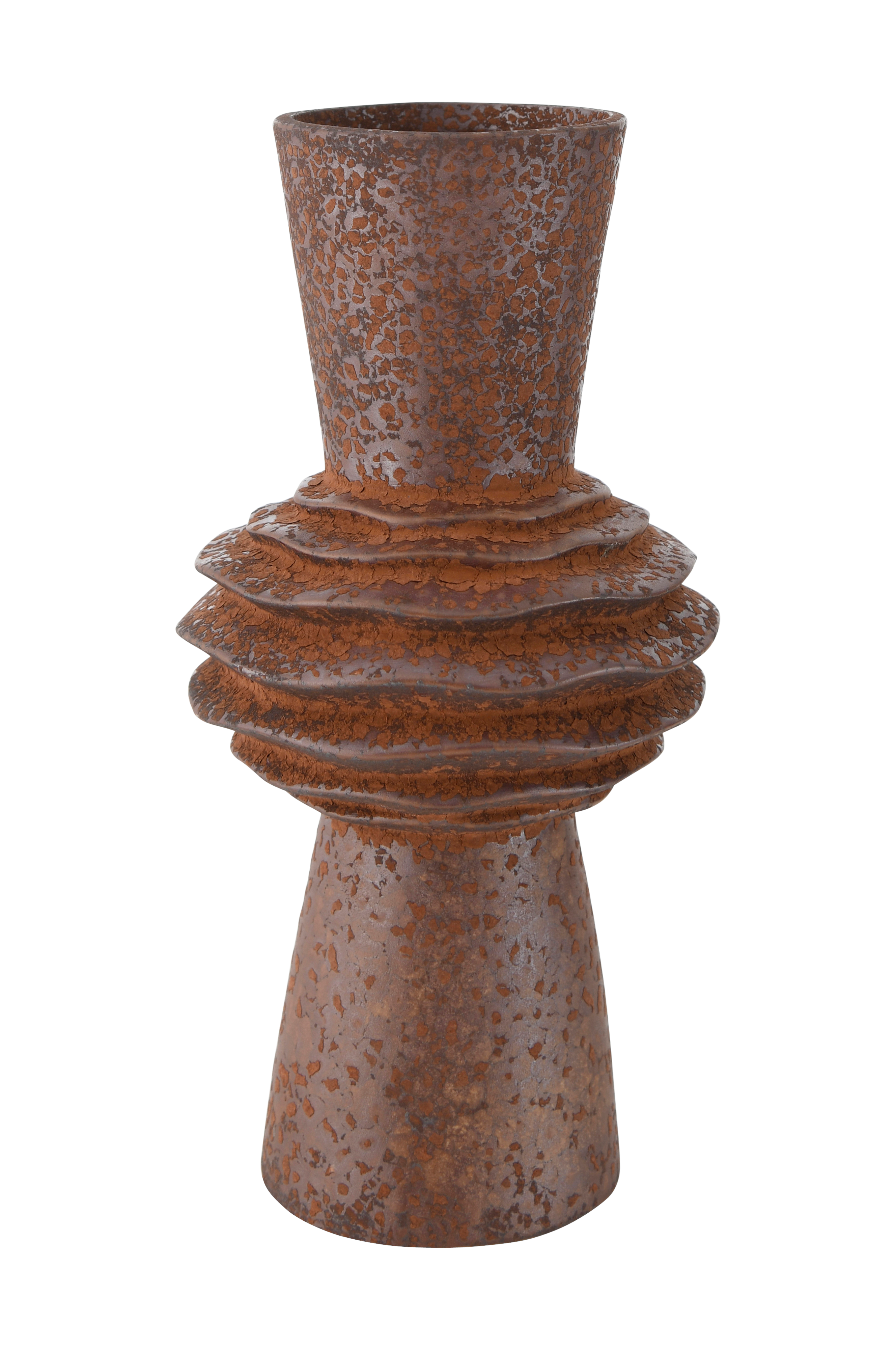 Vas av keramik med patinerad finish. Diameter som störst 12 cm. Innerdiameter öppningen 7 cm.