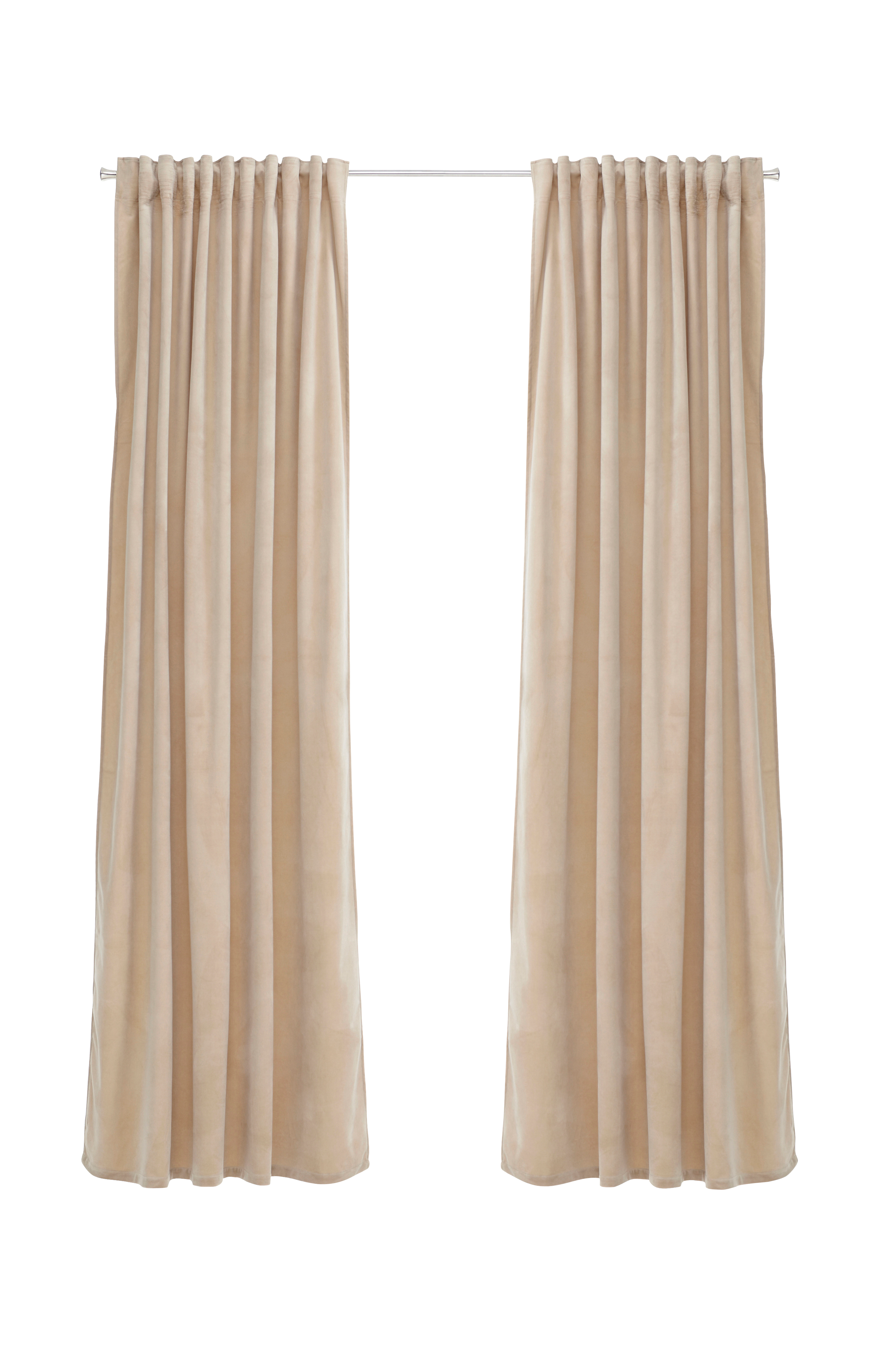 Två sammetsgardiner med fin lyster och mjukt fall. Med multiband som gör att du antingen kan hänga gardinerna direkt på en gardinstång genom de gömda hällorna eller använda ringar och nålkrokar (ej fingerkrokar). Snören i rynkbandet gör att du lätt kan skapa jämna, fina veck. Bredd 140 cm. Tre längder: 220, 250 och 300 cm.