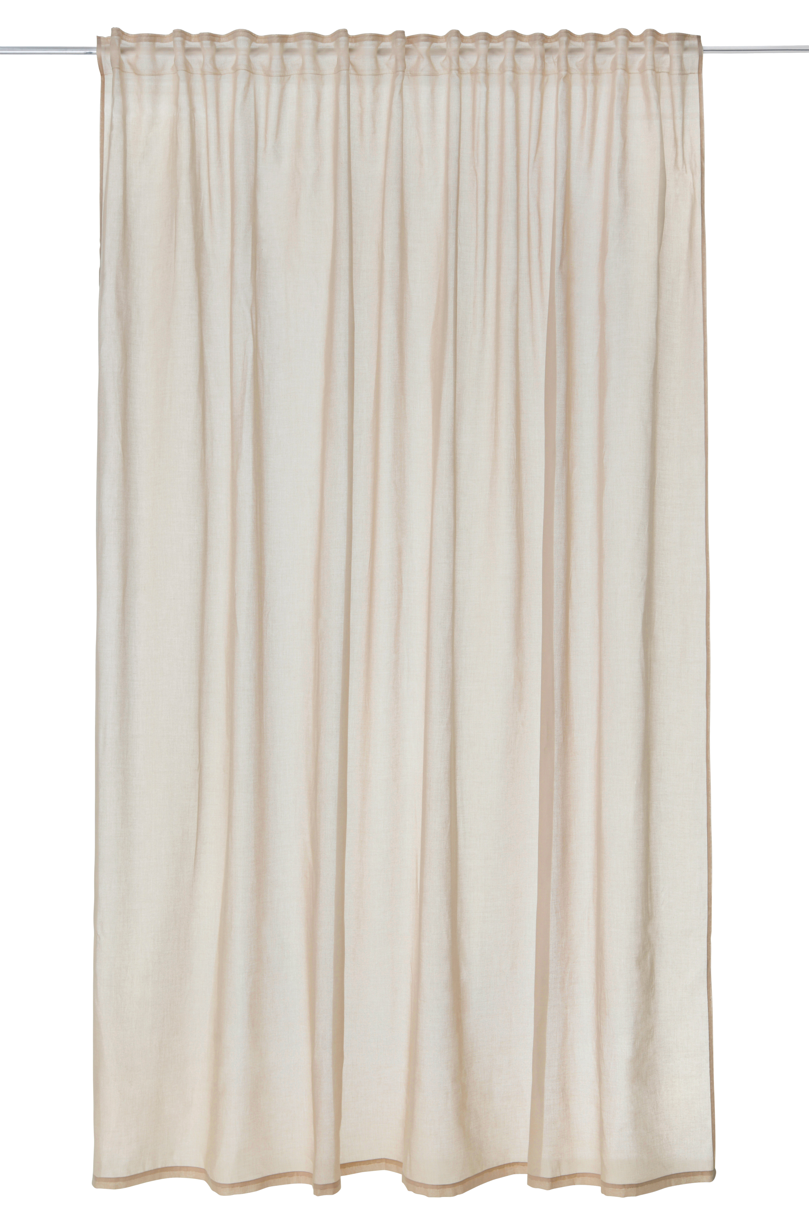 Veckbandslängd i skir kvalitet av glesvävd polyester med bomullskänsla. Med multiband, som gör att du antingen kan hänga gardinen direkt på en gardinstång genom hällorna på baksidan eller använda nålkrokar (ej fingerkrokar). Stl 280x300 cm. Säljs i 1-styck.