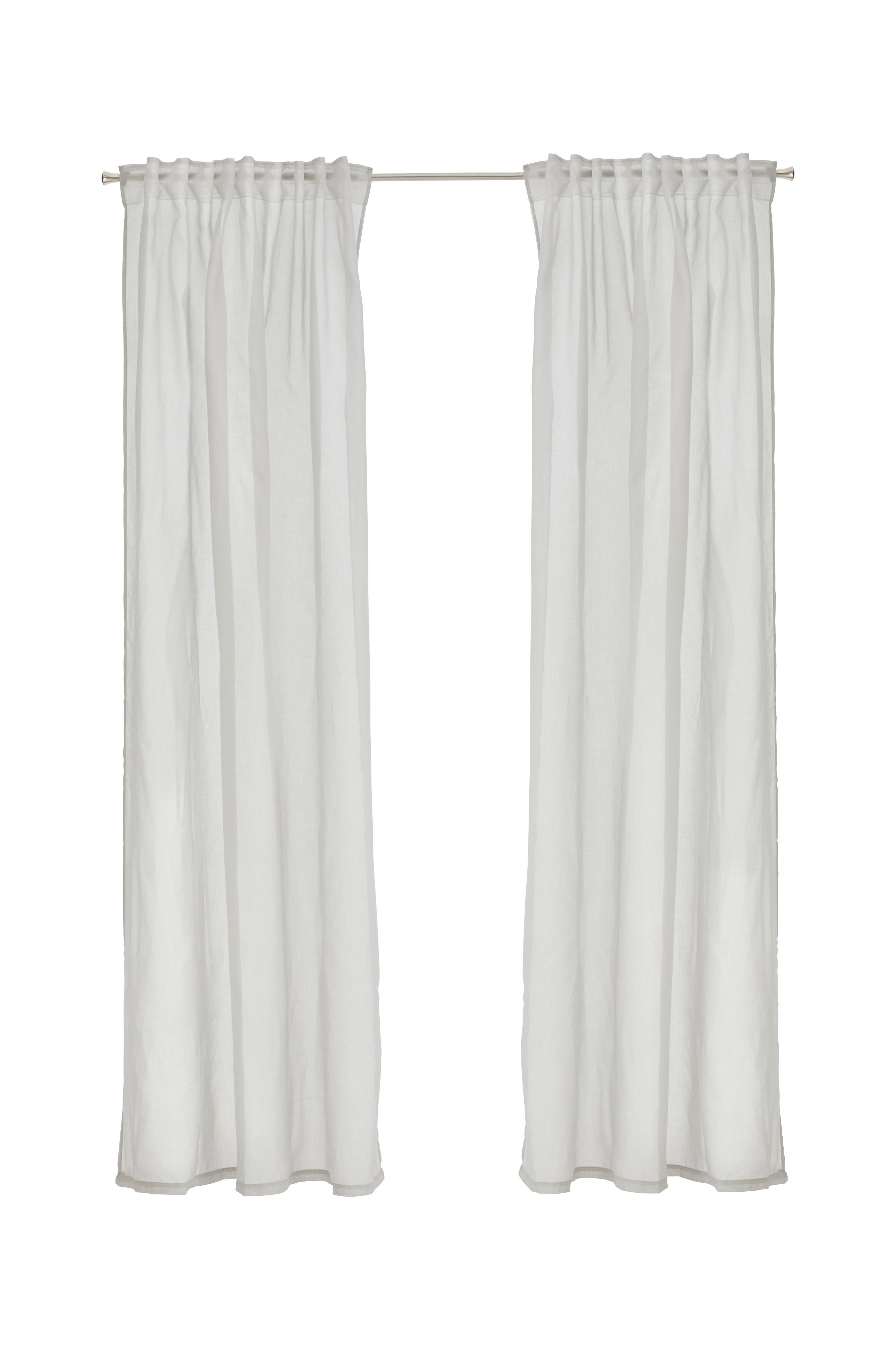 Två veckbandslängder i skir kvalitet av glesvävd polyester med bomullskänsla. Med multiband, som gör att du antingen kan hänga gardinerna direkt på en gardinstång genom hällorna på baksidan eller använda nålkrokar (ej fingerkrokar). Bredd 140 cm. Tre längder: 220, 250 och 300 cm.
