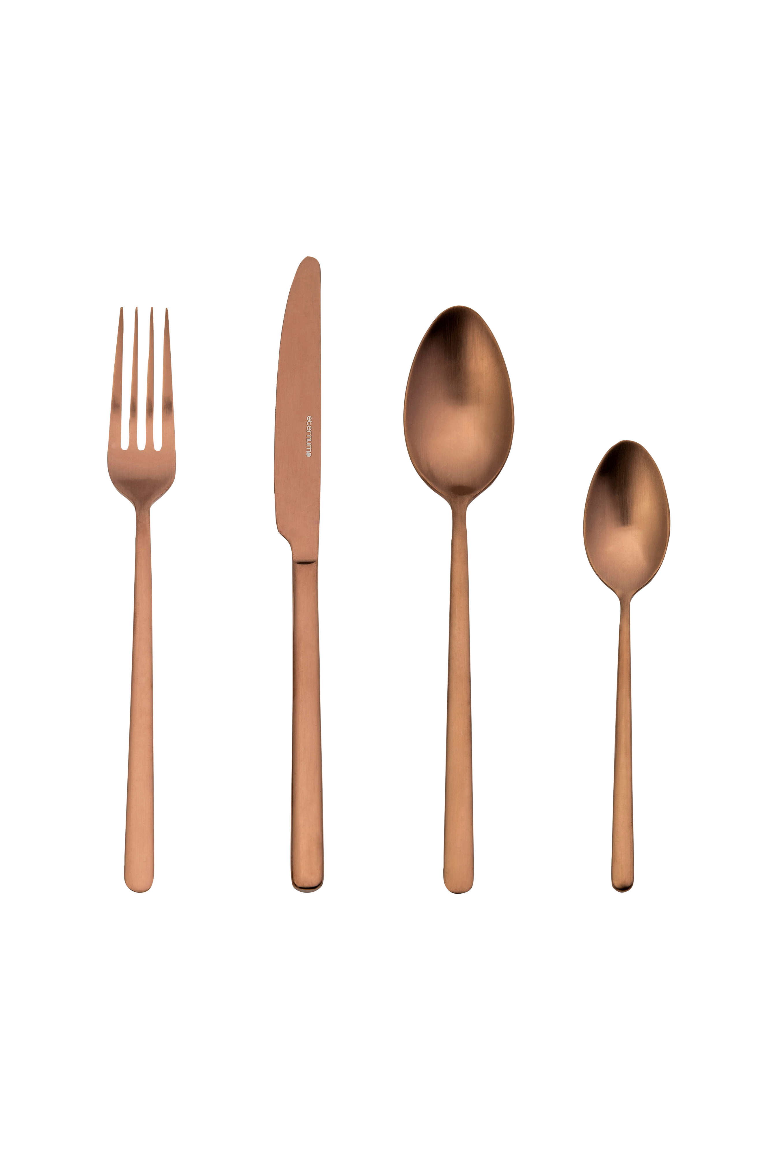 Mångsidig bestickuppsättning från klassiska eternum, denna bestickuppsättning från eternum innehåller fyra knivar, gafflar, matskedar och teskedar vardera. Tillverkad av slitstarkt 18/0 rostfritt stål med kopparfärgad finish, perfekt för en elegant och modern matuppsättning.