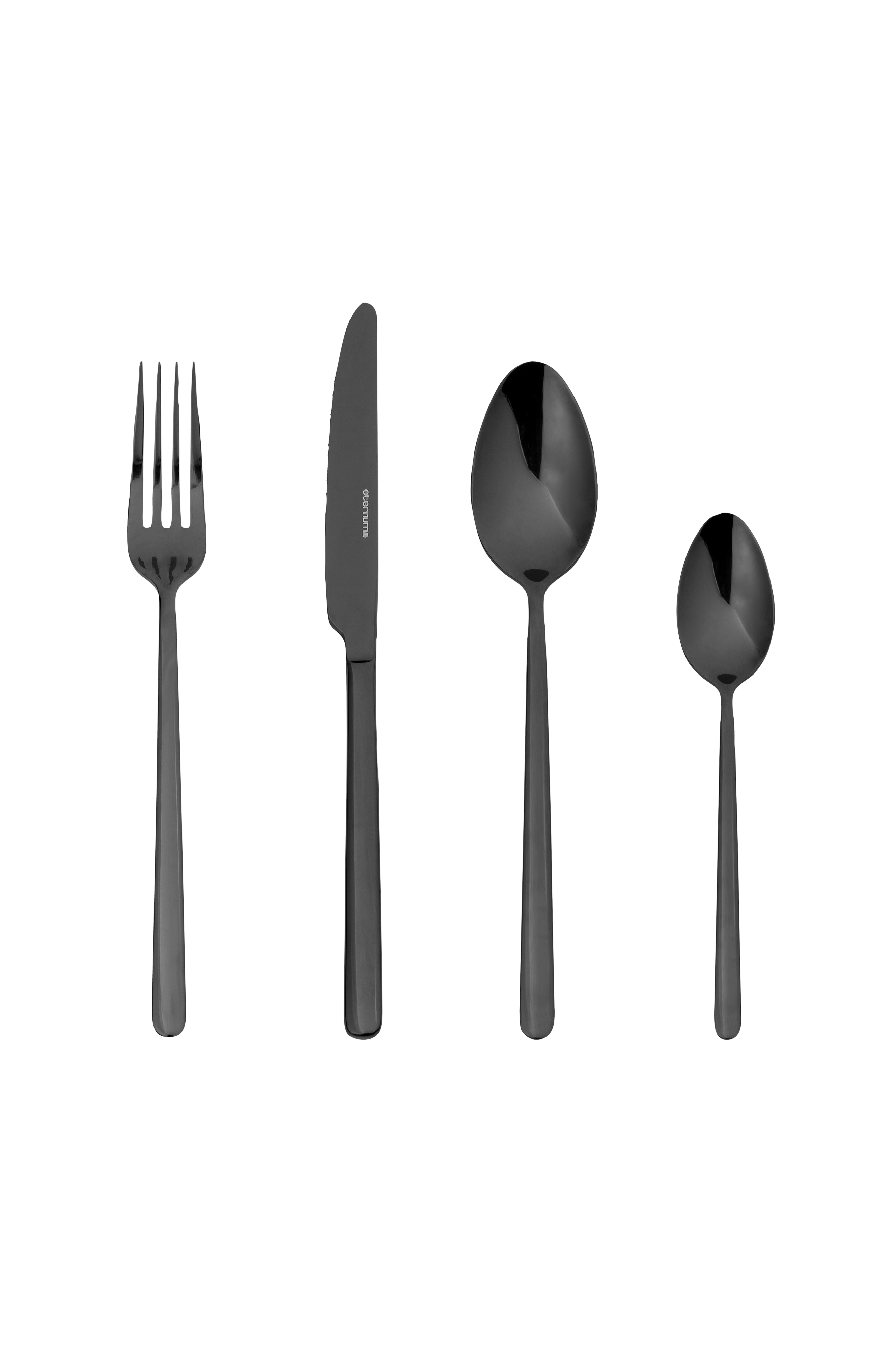 Mångsidig bestickset från klassiska eternum, ett mångsidigt bestickset från eternum, med fyra knivar, gafflar, matskedar och teskedar vardera. De är tillverkade av 18/0 rostfritt stål med en elegant svart beläggning och passar perfekt för både moderna och samtida dukningar.