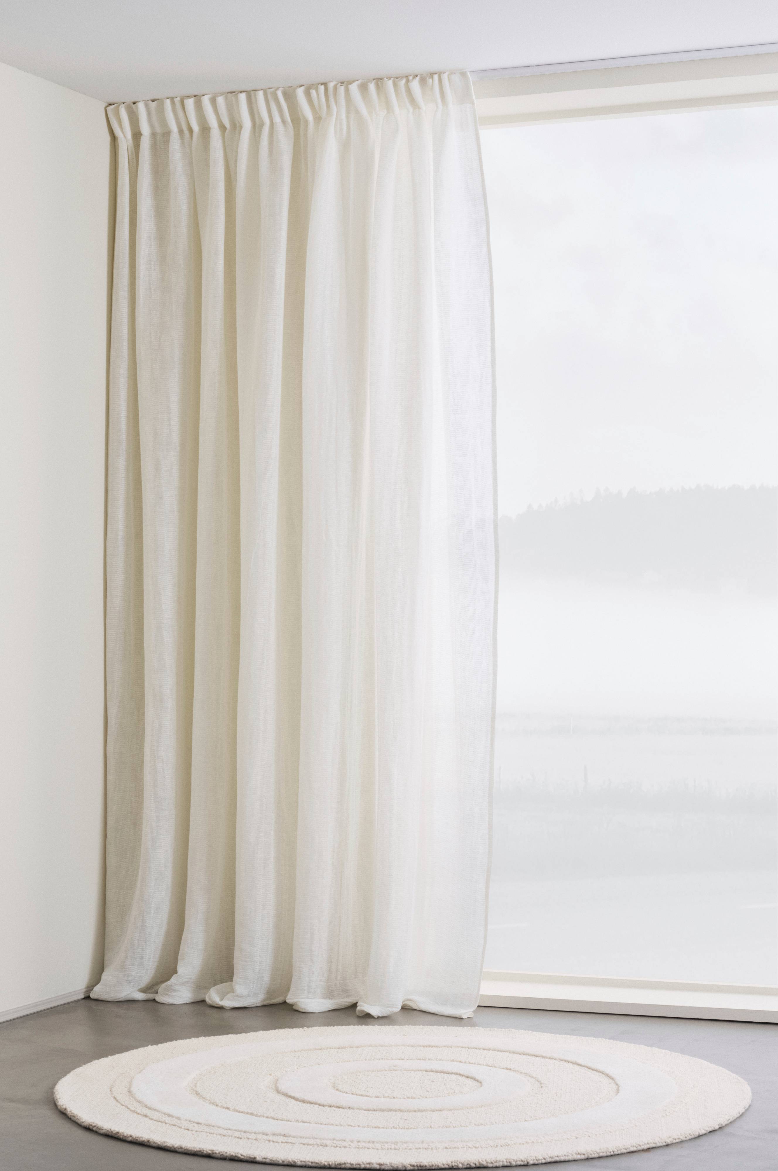 En gardinlängd i skir och följsam kvalité av lin och bomull. Tyget har vävda strukturränder som ger en rustikare och mer livfull känsla till det tunna tyget som har skönt ljusgenomsläpp. Den fina linnekvalitén blir mjukare av bomullen som blandats in och tyget har dessutom tvättats för att få fint fall och mjukhet. Längden har påsytt multifunktionsband och kan hängas upp med fingerkrokar, kanal eller dold hälla. Tygets gramvikt 110 g/m².