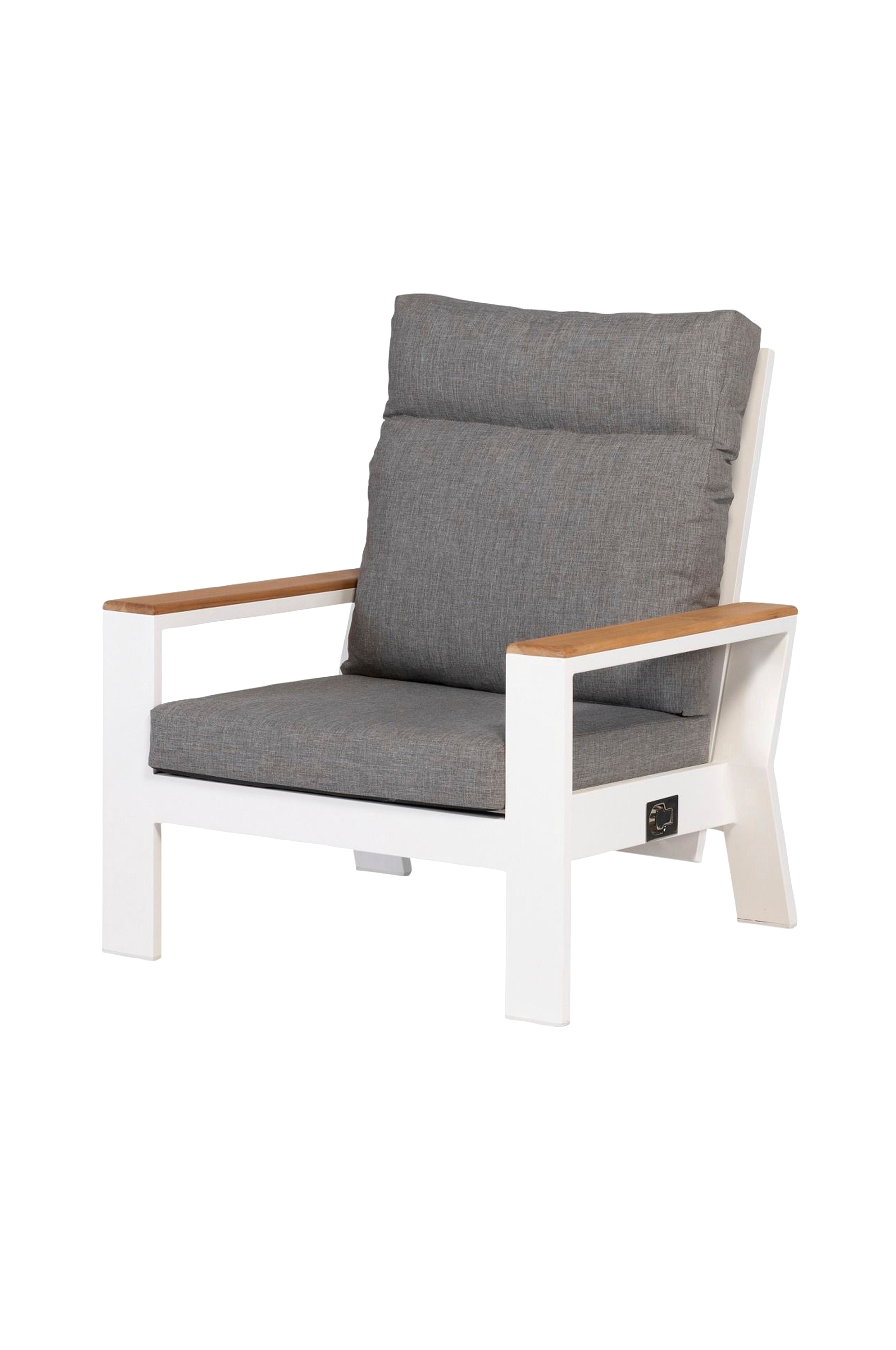 Den justerbara fåtöljen Valerie har en stomme av aluminium som är vackert dekorerad med FSC®-certifierad teak. dessa material är lättskötta.