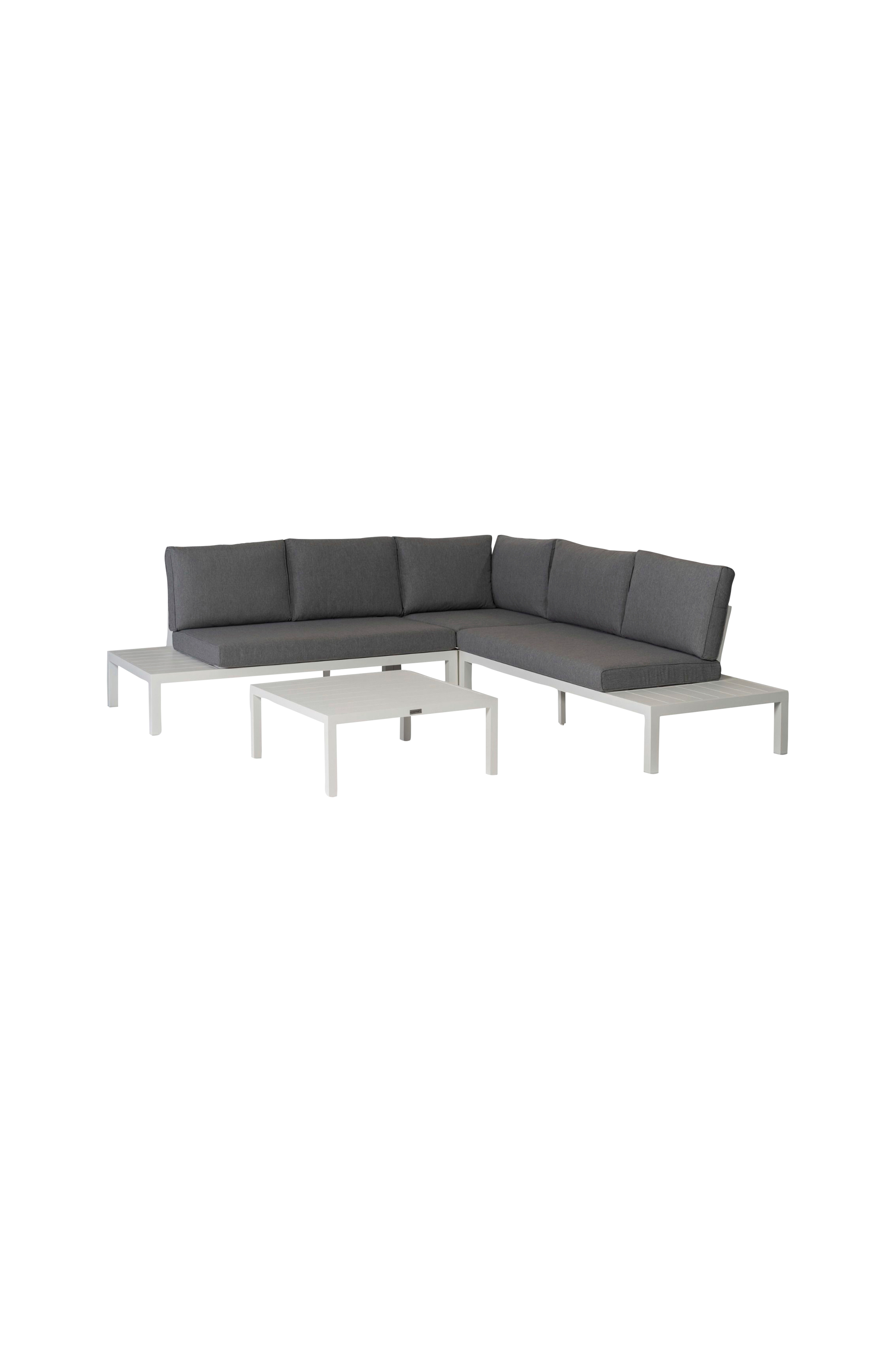 Aluminium är ett väderbeständigt och lättskött material. Setet består av ett soffbord och tre separata moduler som är lätta att sammankoppla. Stommen har vackra dynor. De har en slitstark klädsel av olefin och är fyllda med standardskum.