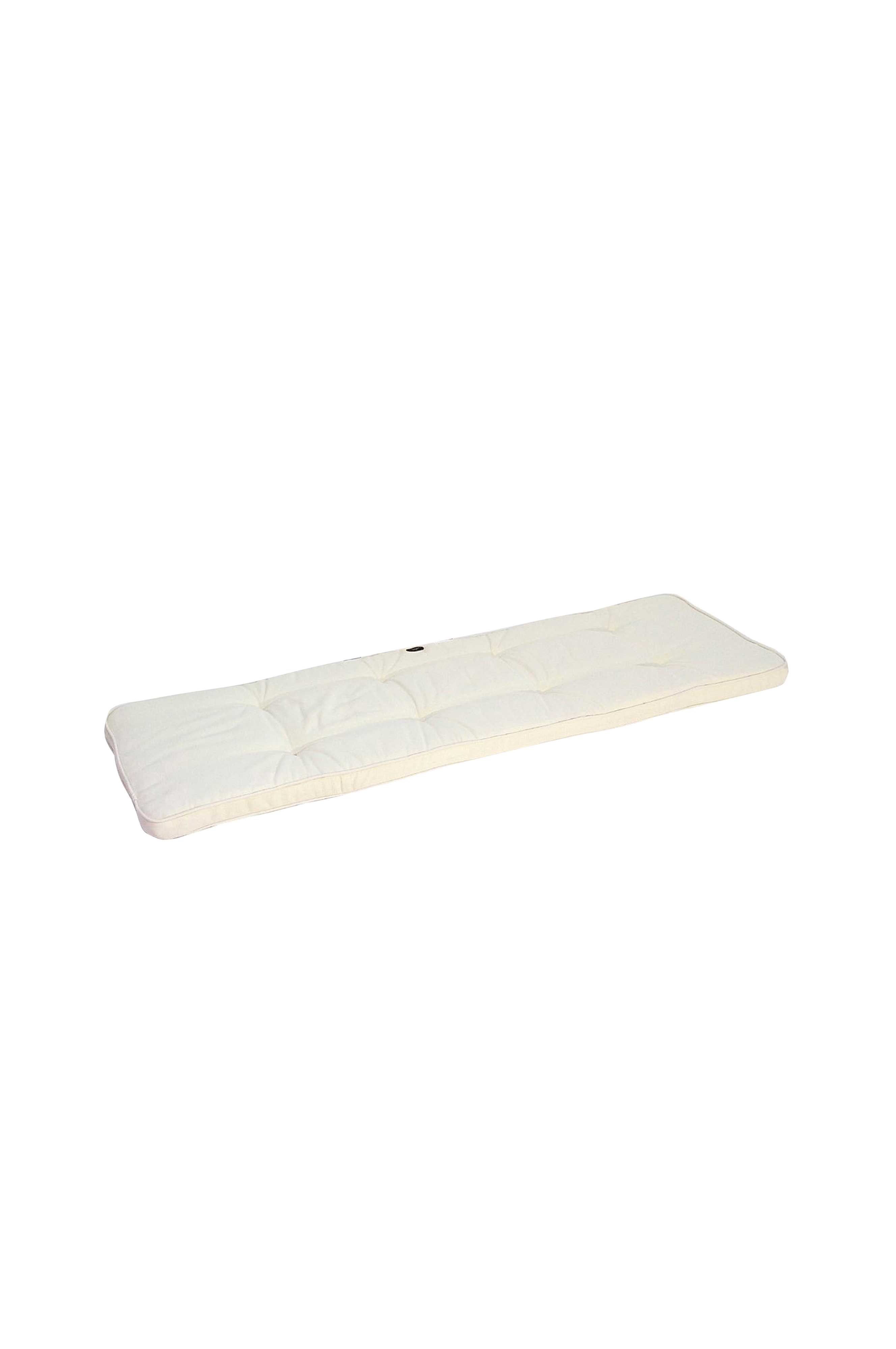 Bänkunderlägg i texturerad dralon med fibervadd runt en tjock skumkärna för mjuk komfort. Boxsydd, 6 cm tjock