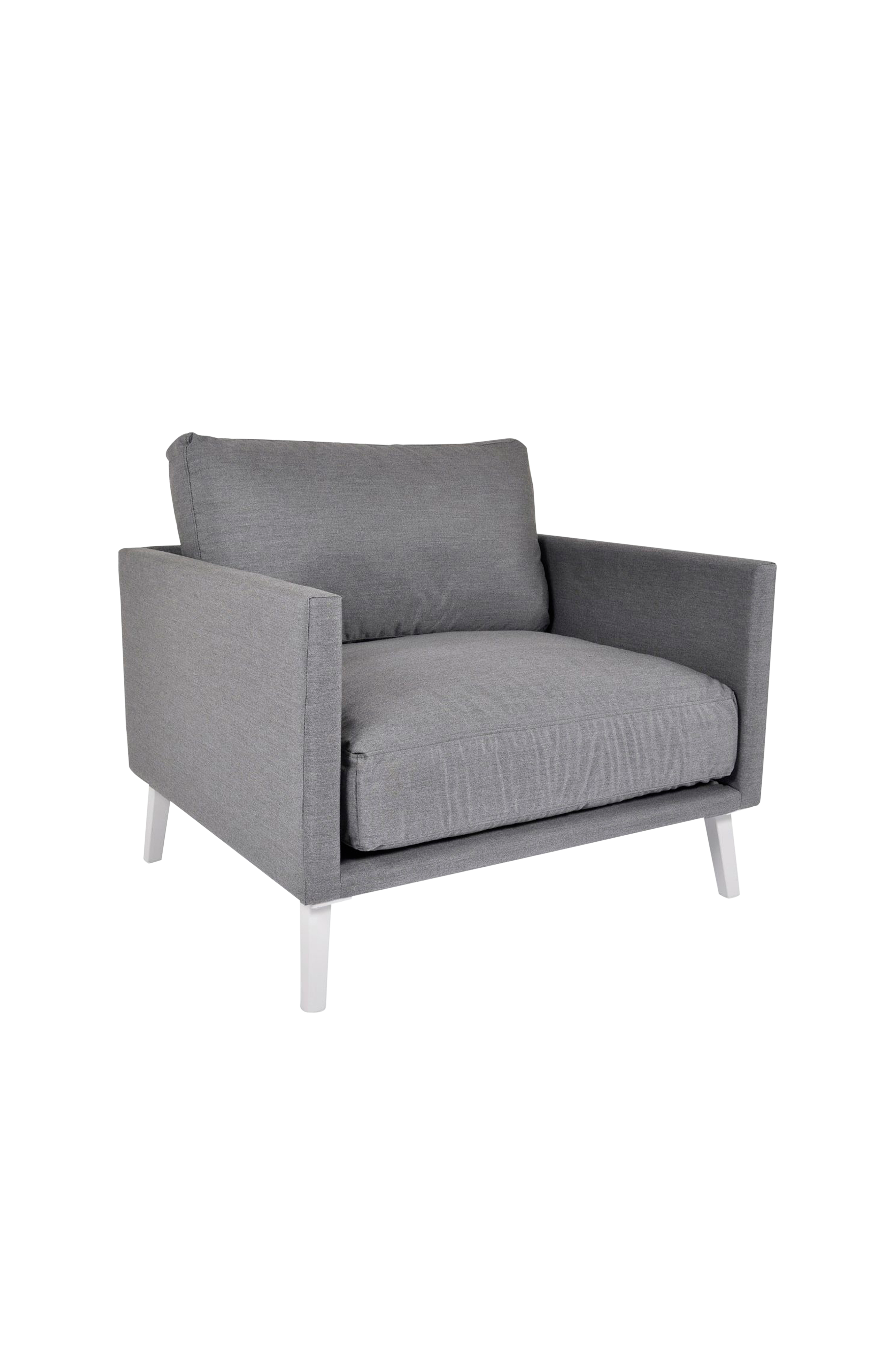 Fåtölj i sunbrellas spun-dyed akryltextil som är vattenavvisande och klarar att stå ute i både regn och snö. Siktbar 30 min efter regn. Material: fyllning: quickdry skum yttertyg: 100% spinnfärgad dralon/akryl underrede: aluminium tvättråd: vatten (svårare fläckar diskmedel) mått: l88 d82 h80cm