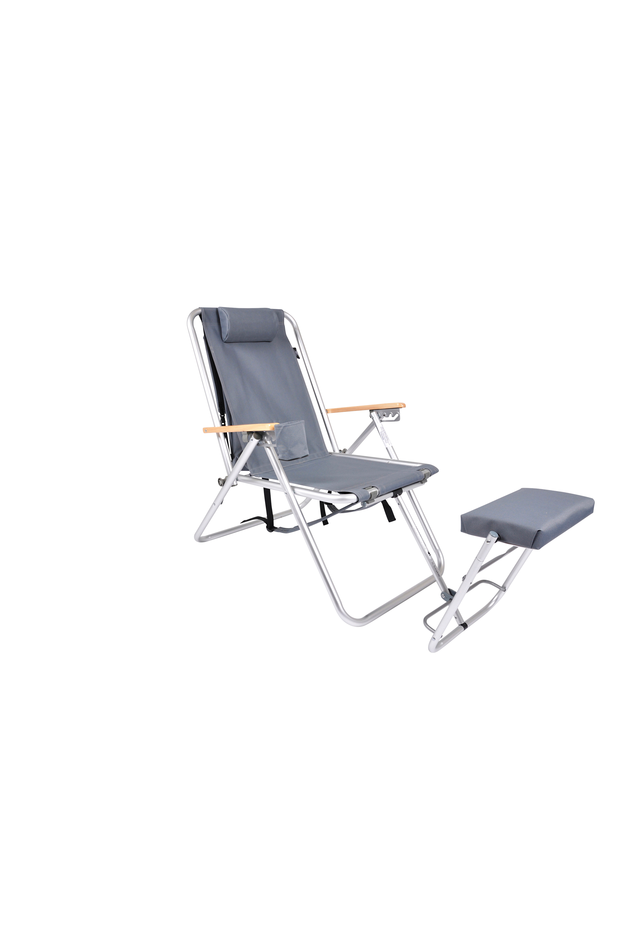 En friluftsstol med trähandtag, ställbar rygg, ryggsäck och fotpall. Denna modellen är högre från marken. Fotpallen kan enkelt vändas och användas som ett litet bord. Material: alumnium och polyester. Maxvikt: 135 kg