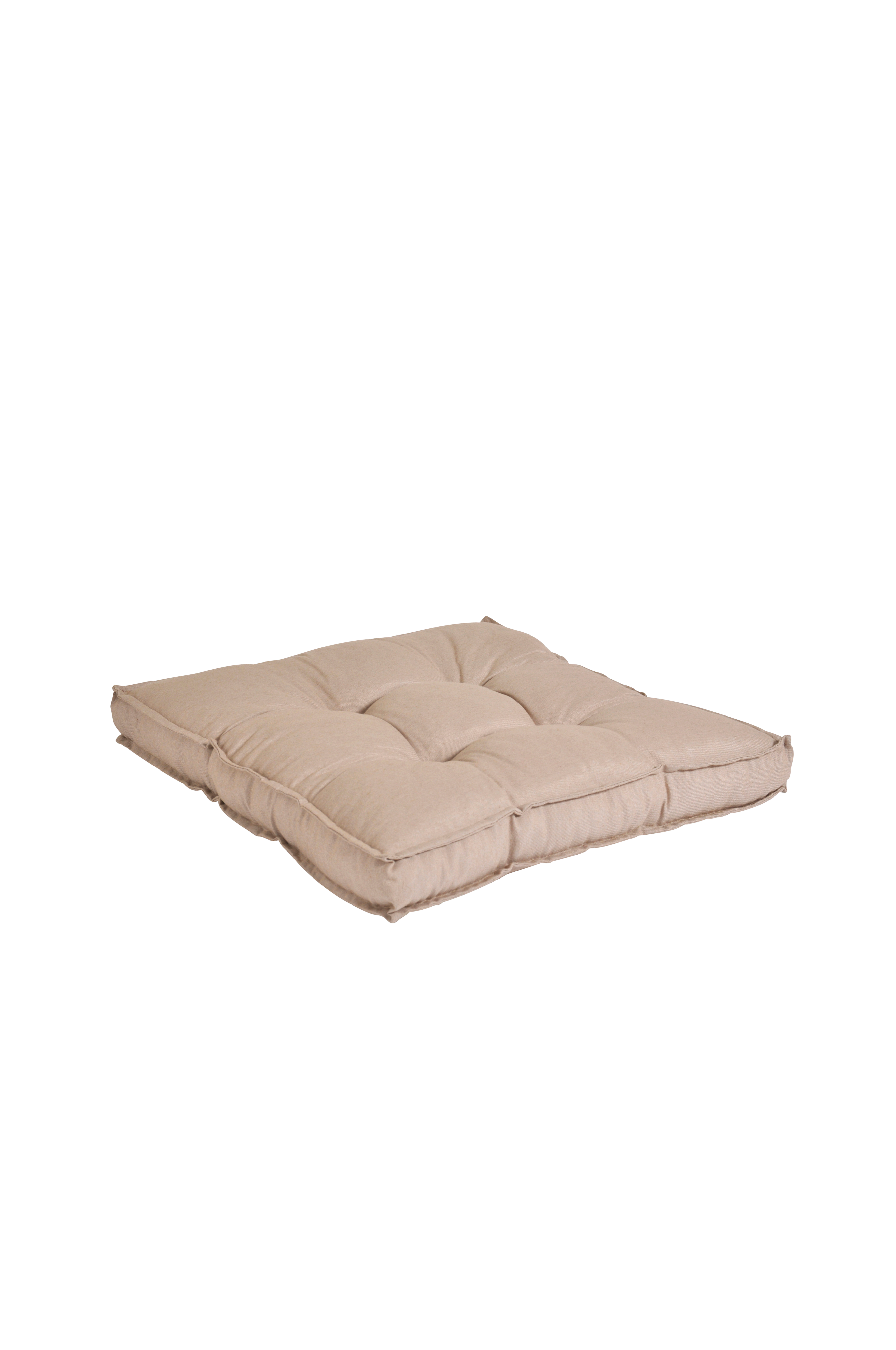 En sittdyna med riven stoppning som gör att dynan kan både krympa och expandera. boxsydd, 15 cm tjock