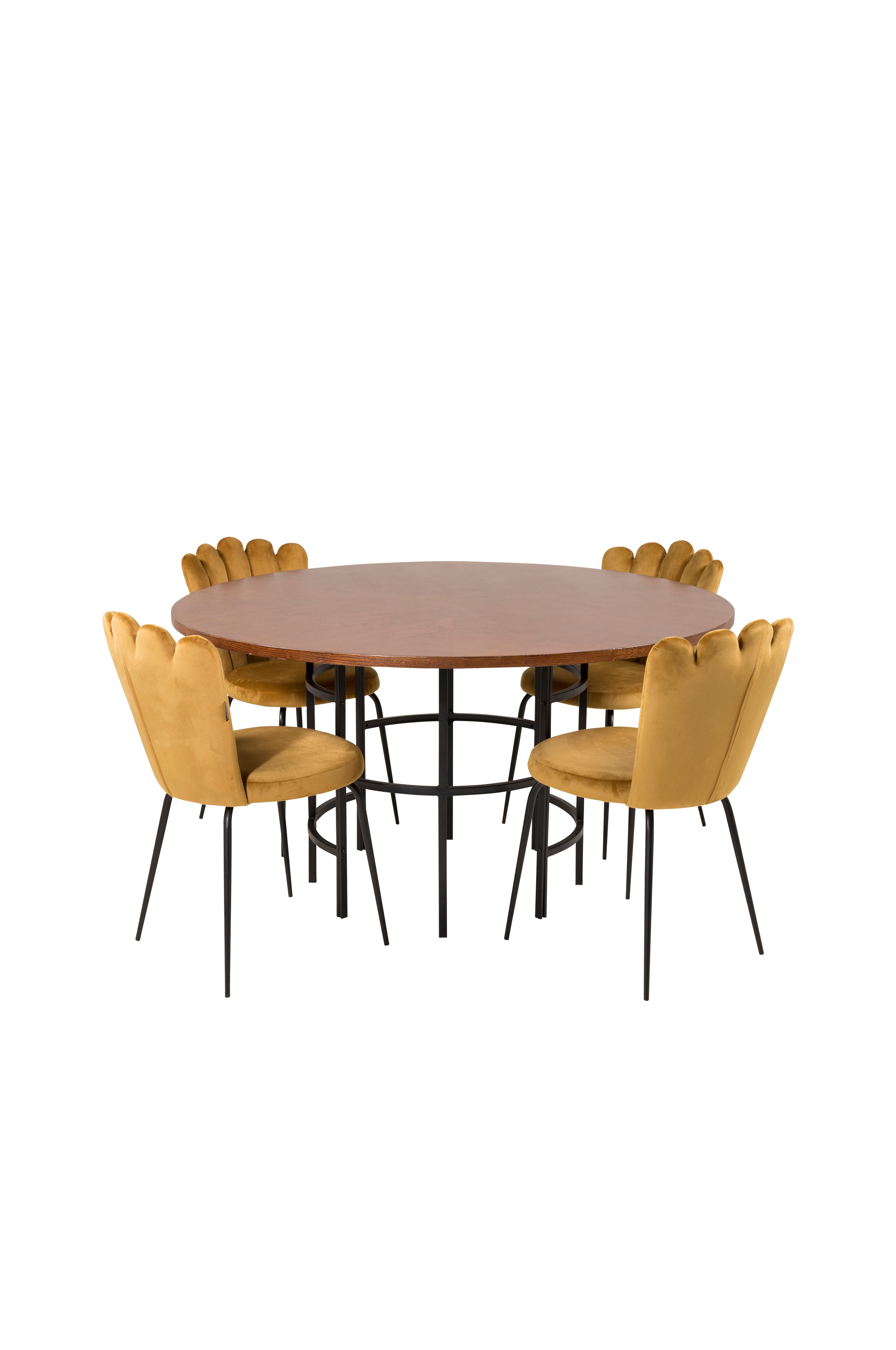 Copenhagen Furniture Fashion matbord med en rund topp i MDF samt fanér och bordsben i metall. Bordets mått: Diameter: 140 cm, Höjd: 74 cm. Med 4 stycken Limhamn Furniture Fashion stolar i sammet och stolsben i metall. Stolens mått: Totalhöjd: 82,5 cm, Bredd: 44,5 cm, Djup: 54 cm, Sitthöjd: 48 cm. Bord och stol kräver enklare montering.