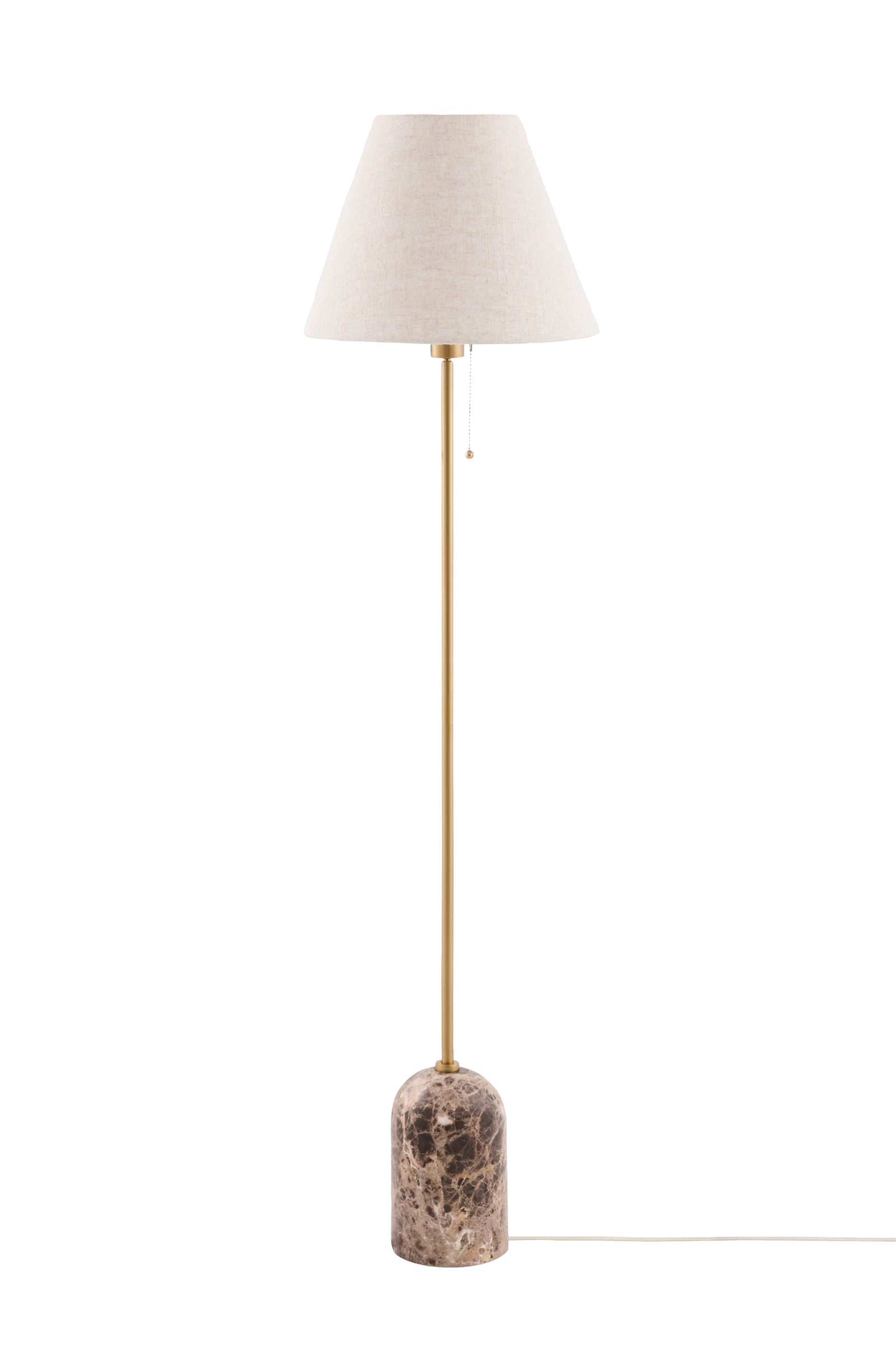 Gino har en solid stenfot med detaljer i äkta mässing och en lampskärm i beige linnetyg. Lampan är utrustad med en 200 cm lång kabel och en dragströmbrytare som sitter under skärmen. Eftersom basen är tillverkad av travertin, ett naturmaterial, kan färgvariationer förekomma. Lampan är kompatibel med dimmer och ljuskälla ingår ej.