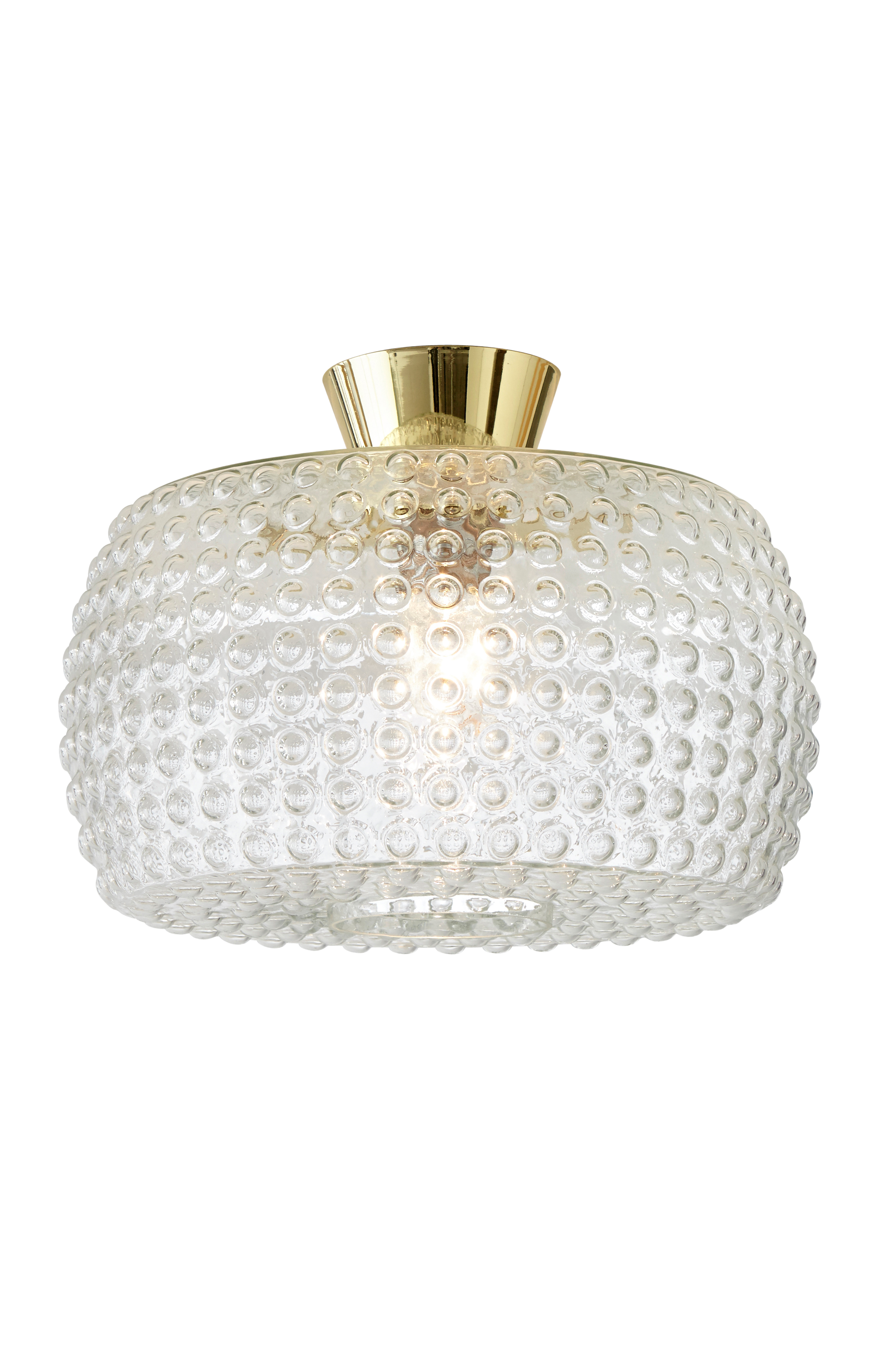 Takplafond av bubbligt klarglas med förmässigat metallupphäng. Höjd 27 cm. Ø 40 cm. Stor sockel E27. Max 60 W.