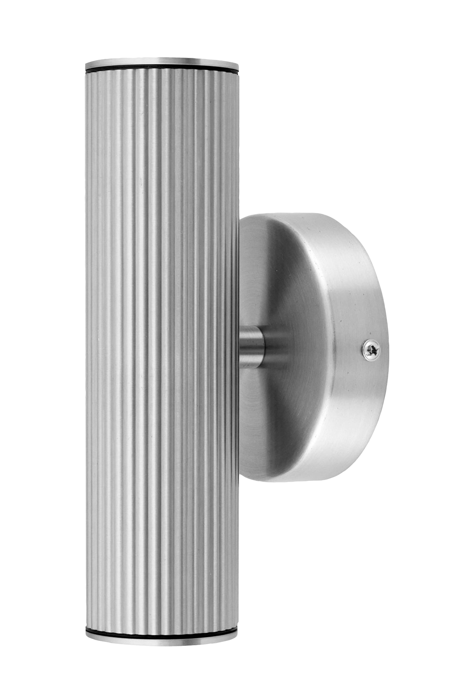 Hubble är en elegant vägglampa som kastar ljus både uppåt och nedåt, vilket skapar ett vackert ljusspel mot väggen. Det räfflade röret är tillverkat av aluminium, vilket gör lampan underhållsfri och motståndskraftig mot rost. Glasskydden i varje ände skruvas enkelt på plats och skyddar ljuskällorna. Med sin ip44-klassning är hubble lämplig för utomhusbruk under tak eller på väggar som är skyddade mot direkt regn. Denna lampa måste kompletteras med två gu10-ljuskällor.