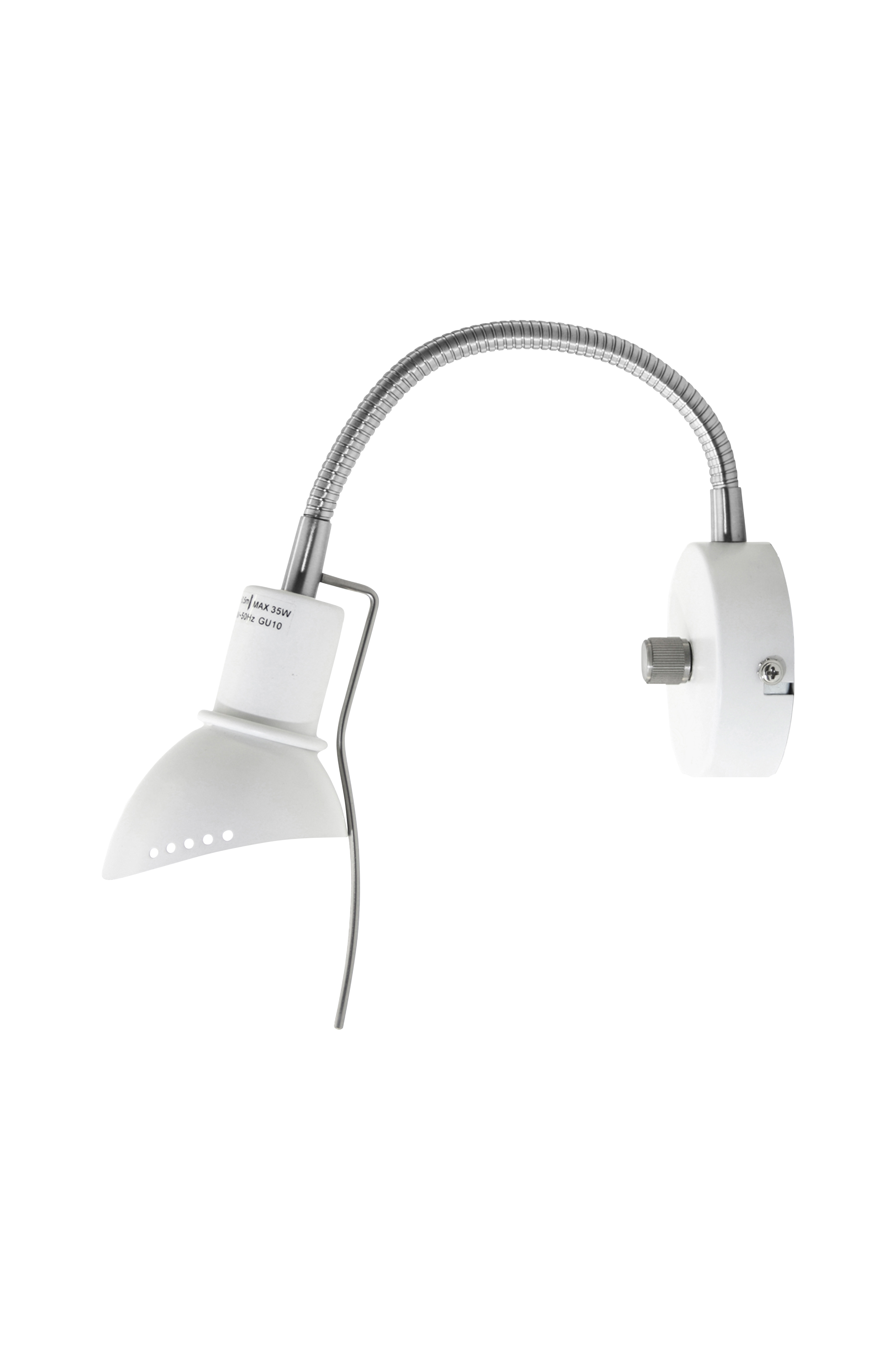 Vägglampa Ingo i metall med dekorativa hålstansningar på kupan och med kromade detaljer och flexiarm. Transparent kabel med dimmer på väggplattan. Höjd 14 cm. Bredd 8 cm ut från vägg 17 cm. Lamphållare GU10. Max 35W. Design: Ingvar Bengtsson.