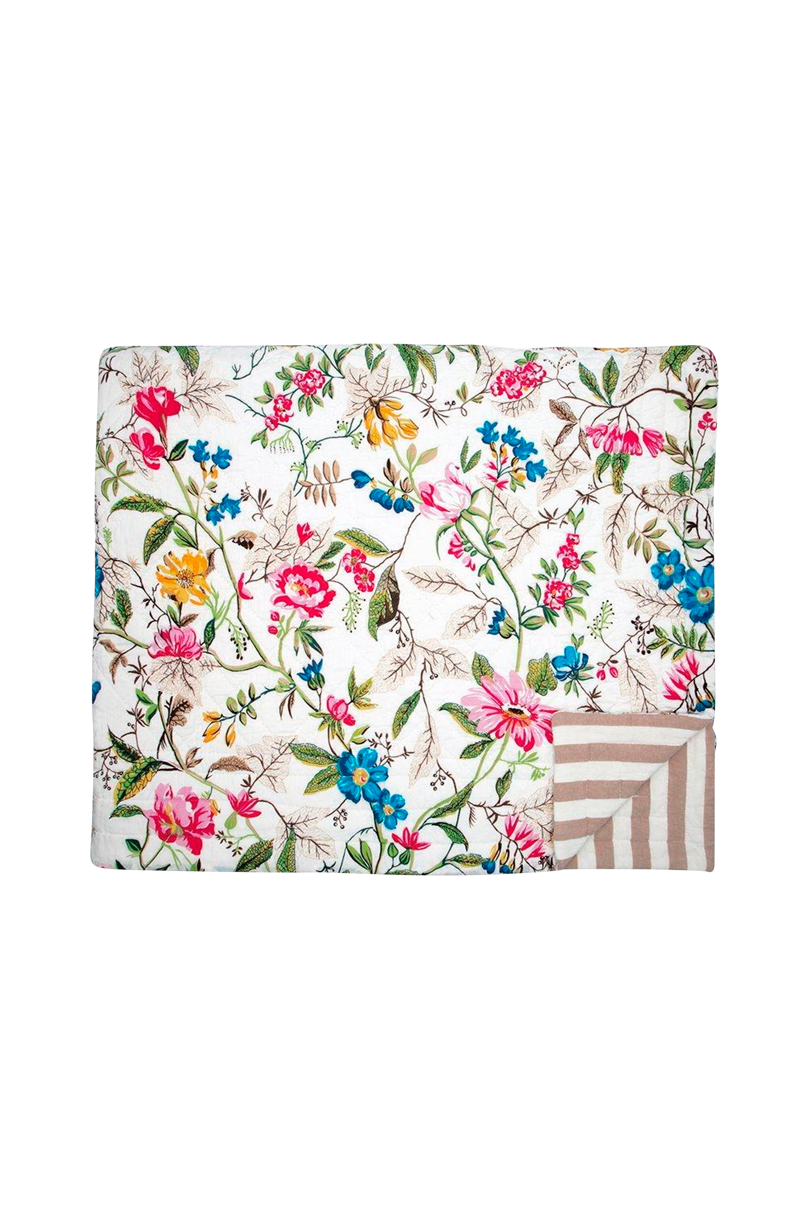 Finaste överkastet med ett härligt blommigt mönster på ena sidan och dämpade sandfärgade och vita ränder på den andra.Använd som överkast på hela sängen eller som en vacker filt i fotändan.Mått: 140 x 220 cm.