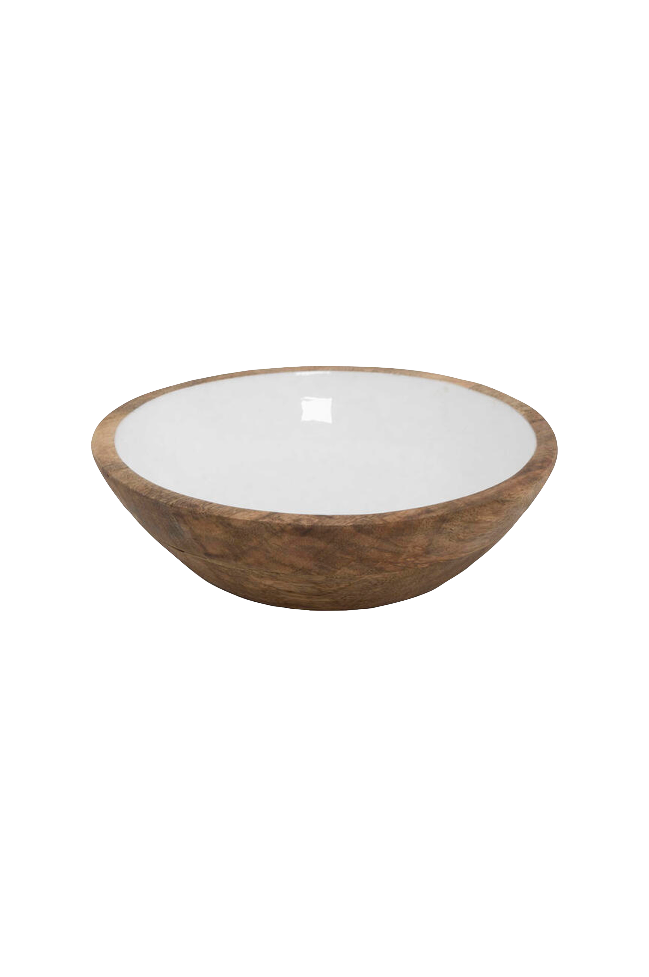 Eleganta skålar i två olika storlekar tillverkade av mangoträ med en glaserad insida i svart eller vitt. Skålarna har en vacker kontrast mellan det naturliga träet och den glittrande glaserade ytan. Träet ger skålarna en härlig struktur som gör dem perfekta för att servera frukt, nötter eller andra godsaker på bordet - både till vardags och vid speciella tillfällen. Samma design finns även i brickor. - 100% mangoträ med glaserad insida - finns med vit och svart glasering - rengör med en fuktig trasa - finns i två olika storlekar: ø13,5x6 och ø25x7,5 cm - Denna produkt ingår i Gustav Ovlands kollektion, stärkelsesfabriken.