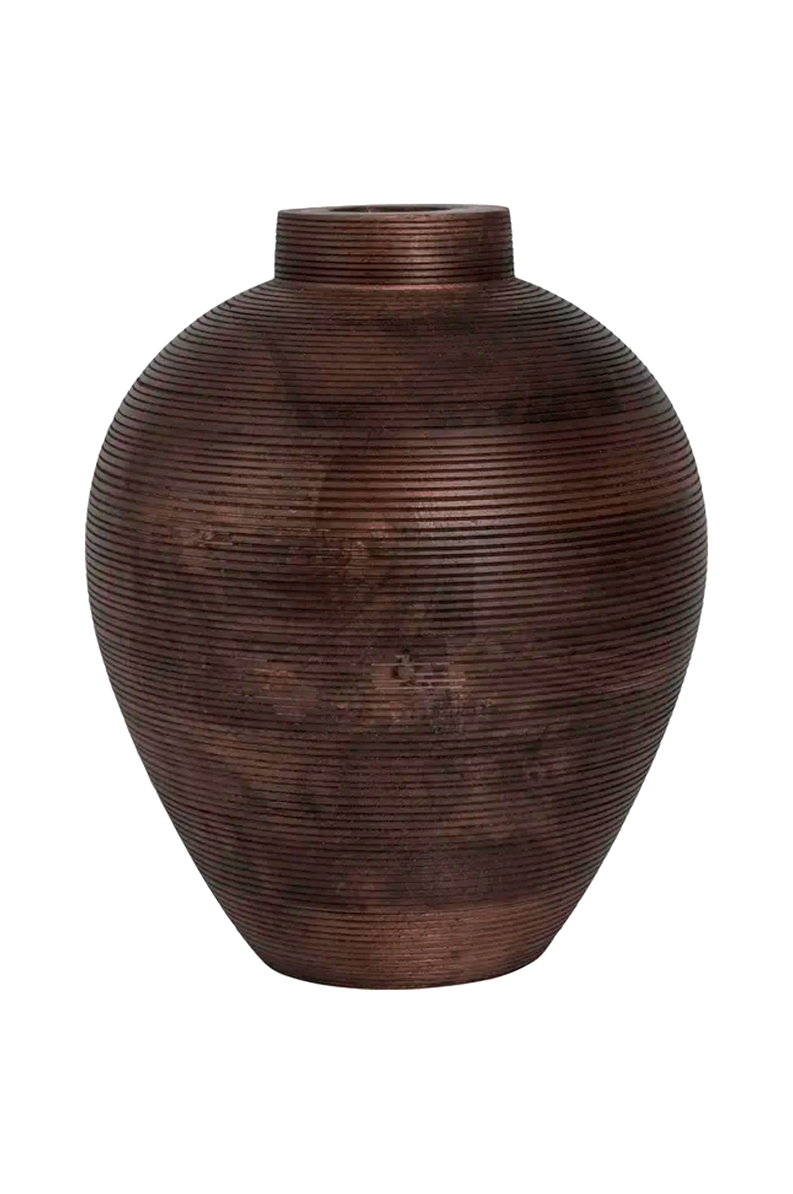 Lesotho-vasen i brunt mangoträ med eleganta räfflor är en dekorativ detalj. Perfekt för att skapa en mysig och naturlig atmosfär på bord, hyllor eller fönsterbrädor. rengörs med en fuktig trasa, burken är en del av halvor bakes kollektion.