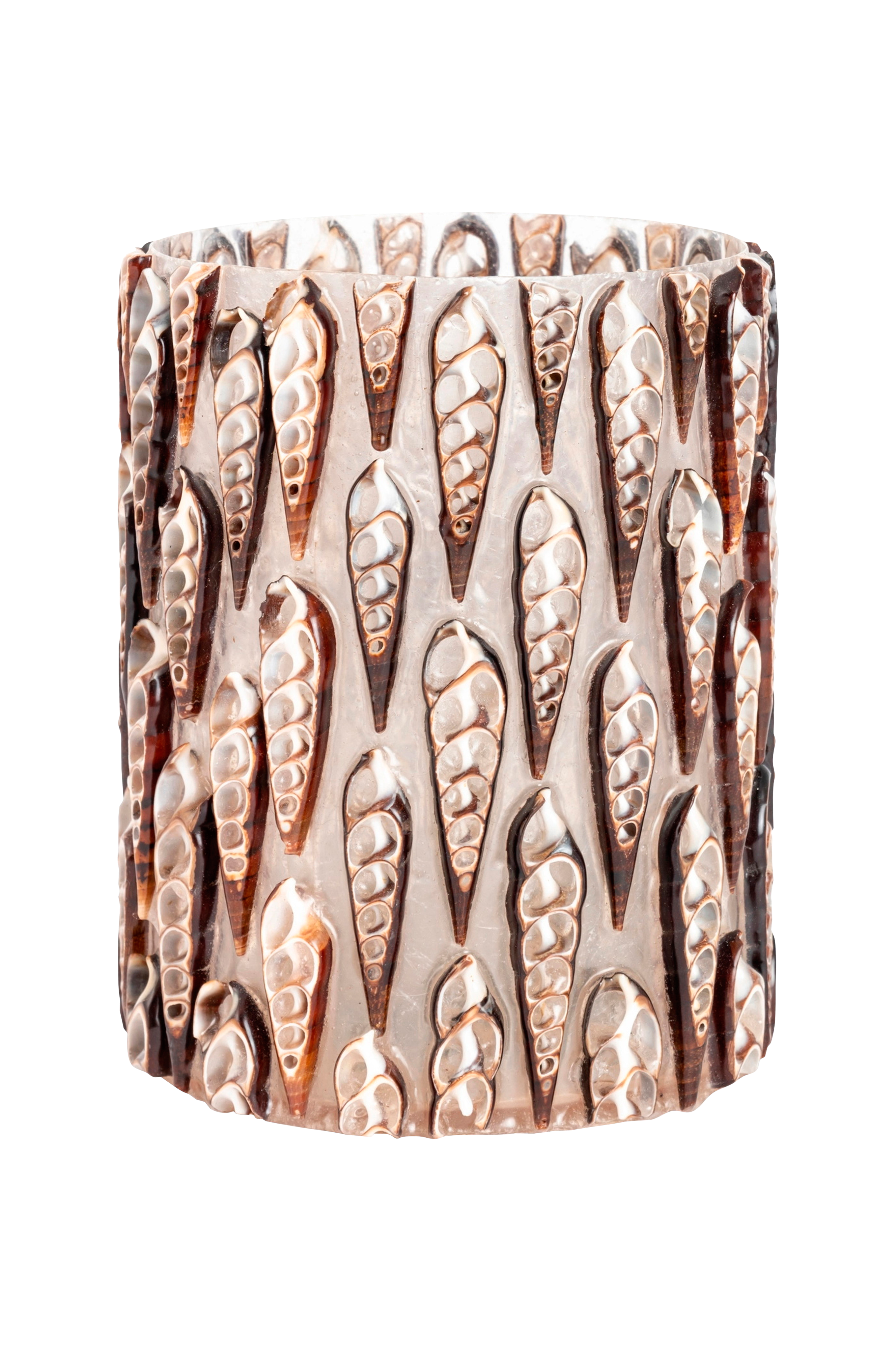 Pisa värmeljushållare i brunt. Handgjord, där varje del har sin egen unika charm. De små snäckskalen skapar ett vackert och stämningsfullt ljus, perfekt för att skapa en mysig atmosfär i ditt hem. material: glas och snäckskal. Värmeljushållaren är en del av Halvor Bakkes kollektion
